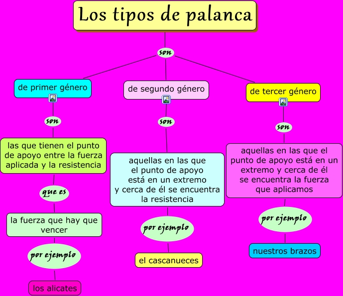 Este Cmap, tiene información relacionada con: Los tipos de palanca, de segundo género son aquellas en las que el punto de apoyo está en un extremo y cerca de él se encuentra la resistencia, aquellas en las que el punto de apoyo está en un extremo y cerca de él se encuentra la fuerza que aplicamos por ejemplo nuestros brazos, Los tipos de palanca son de primer género, aquellas en las que el punto de apoyo está en un extremo y cerca de él se encuentra la resistencia por ejemplo el cascanueces, de tercer género son aquellas en las que el punto de apoyo está en un extremo y cerca de él se encuentra la fuerza que aplicamos, Los tipos de palanca son de segundo género, las que tienen el punto de apoyo entre la fuerza aplicada y la resistencia que es la fuerza que hay que vencer, la fuerza que hay que vencer por ejemplo los alicates, Los tipos de palanca son de tercer género, de primer género son las que tienen el punto de apoyo entre la fuerza aplicada y la resistencia
