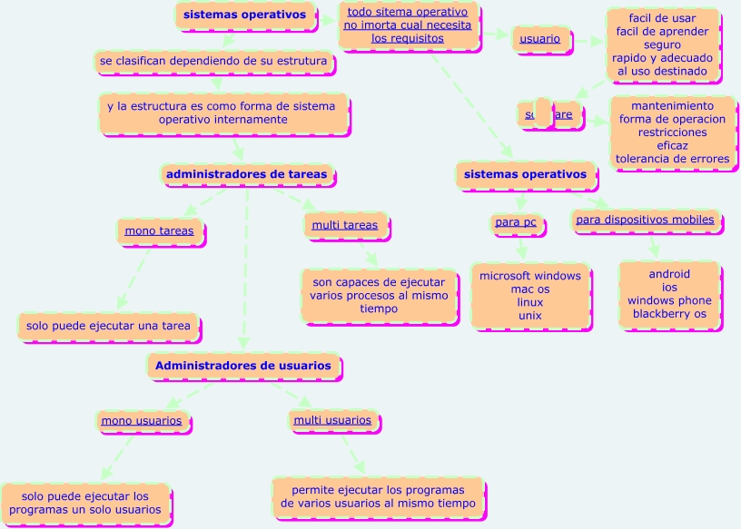 Este Cmap, tiene información relacionada con: Mapa Conceptual de los sistemas operativos, y la estructura es como forma de sistema operativo internamente administradores de tareas multi tareas, Administradores de usuarios mono usuarios solo puede ejecutar los programas un solo usuarios, usuario facil de usar facil de aprender seguro rapido y adecuado al uso destinado software, sistemas operativos todo sitema operativo no imorta cual necesita los requisitos usuario, mono tareas ???? solo puede ejecutar una tarea, Administradores de usuarios multi usuarios permite ejecutar los programas de varios usuarios al mismo tiempo, software mantenimiento forma de operacion restricciones eficaz tolerancia de errores, sistemas operativos para pc microsoft windows mac os linux unix, y la estructura es como forma de sistema operativo internamente administradores de tareas mono tareas, sistemas operativos todo sitema operativo no imorta cual necesita los requisitos sistemas operativos, sistemas operativos para dispositivos mobiles android ios windows phone blackberry os, y la estructura es como forma de sistema operativo internamente administradores de tareas Administradores de usuarios, sistemas operativos se clasifican dependiendo de su estrutura y la estructura es como forma de sistema operativo internamente, multi tareas ???? son capaces de ejecutar varios procesos al mismo tiempo