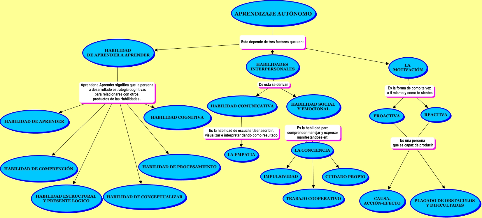 Este Cmap, tiene información relacionada con: Mapa Conceptual Aprendizaje Autónomo, PROACTIVA Es una persona que es capaz de producir CAUSA. ACCIÓN-EFECTO, LA MOTIVACIÓN Es la forma de como te vez a ti mismo y como te sientes REACTIVA, APRENDIZAJE AUTÓNOMO Este depende de tres factores que son: LA MOTIVACIÓN, HABILIDAD DE APRENDER A APRENDER Aprender a Aprender significa que la persona a desarrollado estrategia cognitivas para relacionarse con otros. productos de las Habilidades . HABILIDAD COGNITIVA, HABILIDAD DE APRENDER A APRENDER Aprender a Aprender significa que la persona a desarrollado estrategia cognitivas para relacionarse con otros. productos de las Habilidades . HABILIDAD ESTRUCTURAL Y PRESENTE LOGICO, REACTIVA Es una persona que es capaz de producir PLAGADO DE OBSTACULOS Y DIFICULTADES, APRENDIZAJE AUTÓNOMO Este depende de tres factores que son: HABILIDADES INTERPERSONALES, LA MOTIVACIÓN Es la forma de como te vez a ti mismo y como te sientes PROACTIVA, HABILIDAD DE APRENDER A APRENDER Aprender a Aprender significa que la persona a desarrollado estrategia cognitivas para relacionarse con otros. productos de las Habilidades . HABILIDAD DE PROCESAMIENTO, HABILIDAD SOCIAL Y EMOCIONAL Es la habilidad para comprender,manejar y expresar manifestandose en: IMPULSIVIDAD, HABILIDAD DE APRENDER A APRENDER Aprender a Aprender significa que la persona a desarrollado estrategia cognitivas para relacionarse con otros. productos de las Habilidades . HABILIDAD DE COMPRENCIÓN, HABILIDAD COMUNICATIVA Es la habilidad de escuchar,leer,escribir, visualizar e interpretar dando como resultado LA EMPATIA, HABILIDAD SOCIAL Y EMOCIONAL Es la habilidad para comprender,manejar y expresar manifestandose en: LA CONCIENCIA, APRENDIZAJE AUTÓNOMO Este depende de tres factores que son: HABILIDAD DE APRENDER A APRENDER, PROACTIVA Es una persona que es capaz de producir PLAGADO DE OBSTACULOS Y DIFICULTADES, REACTIVA Es una persona que es capaz de producir CAUSA. ACCIÓN-EFECTO, HABILIDAD DE APRENDER A APRENDER Aprender a Aprender significa que la persona a desarrollado estrategia cognitivas para relacionarse con otros. productos de las Habilidades . HABILIDAD DE APRENDER, HABILIDAD SOCIAL Y EMOCIONAL Es la habilidad para comprender,manejar y expresar manifestandose en: TRABAJO COOPERATIVO, HABILIDADES INTERPERSONALES De esta se derivan HABILIDAD COMUNICATIVA, HABILIDAD SOCIAL Y EMOCIONAL Es la habilidad para comprender,manejar y expresar manifestandose en: CUIDADO PROPIO