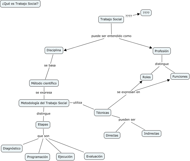 Este Cmap, tiene información relacionada con: Carmen Gloria Jarpa A 1, Técnicas pueden ser Indirectas, Técnicas se expresan en Roles, Etapas que son Evaluación, Trabajo Social ???? ????, Técnicas se expresan en Funciones, Disciplina se basa Método científico, Metodología del Trabajo Social distingue Etapas, Trabajo Social puede ser entendido como Disciplina, Método científico se expresa Metodología del Trabajo Social, Profesión distingue Roles, Técnicas pueden ser Directas, Etapas que son Ejecución, Etapas que son Programación, Trabajo Social puede ser entendido como Profesión, Metodología del Trabajo Social utiliza Técnicas, Profesión distingue Funciones, Etapas que son Diagnóstico