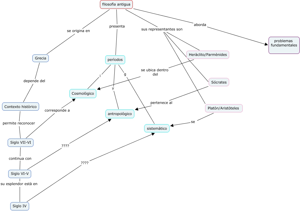 Este Cmap, tiene información relacionada con: ff, Siglo VI-V ???? antropològico, filosofìa antigua sus representantes son Platòn/Aristòteles, filosofìa antigua presenta perìodos, filosofìa antigua aborda problemas fundamentales, Siglo VII-VI continua con Siglo VI-V, Sócrates pertenece al antropològico, perìodos y antropològico, filosofìa antigua se origina en Grecia, Grecia depende del Contexto històrico, Siglo IV ???? sistemàtico, Contexto històrico permite reconocer Siglo VII-VI, Heràclito/Parmènides se ubica dentro del Cosmològico, Siglo VI-V su esplendor està en Siglo IV, perìodos i Cosmològico, filosofìa antigua sus representantes son Heràclito/Parmènides, Platòn/Aristòteles se sistemàtico, Siglo VII-VI corresponde a Cosmològico, filosofìa antigua sus representantes son Sócrates, perìodos g sistemàtico