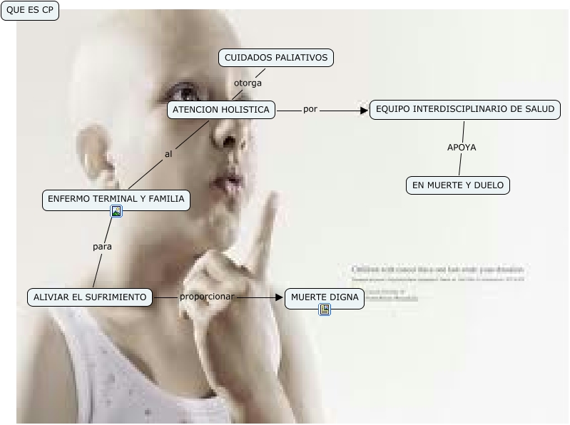 Este Cmap, tiene información relacionada con: CUIDADO PALIATIVO, ENFERMO TERMINAL Y FAMILIA para ALIVIAR EL SUFRIMIENTO, EQUIPO INTERDISCIPLINARIO DE SALUD APOYA EN MUERTE Y DUELO, ALIVIAR EL SUFRIMIENTO proporcionar MUERTE DIGNA, CUIDADOS PALIATIVOS otorga ATENCION HOLISTICA, ATENCION HOLISTICA por EQUIPO INTERDISCIPLINARIO DE SALUD, ATENCION HOLISTICA al ENFERMO TERMINAL Y FAMILIA