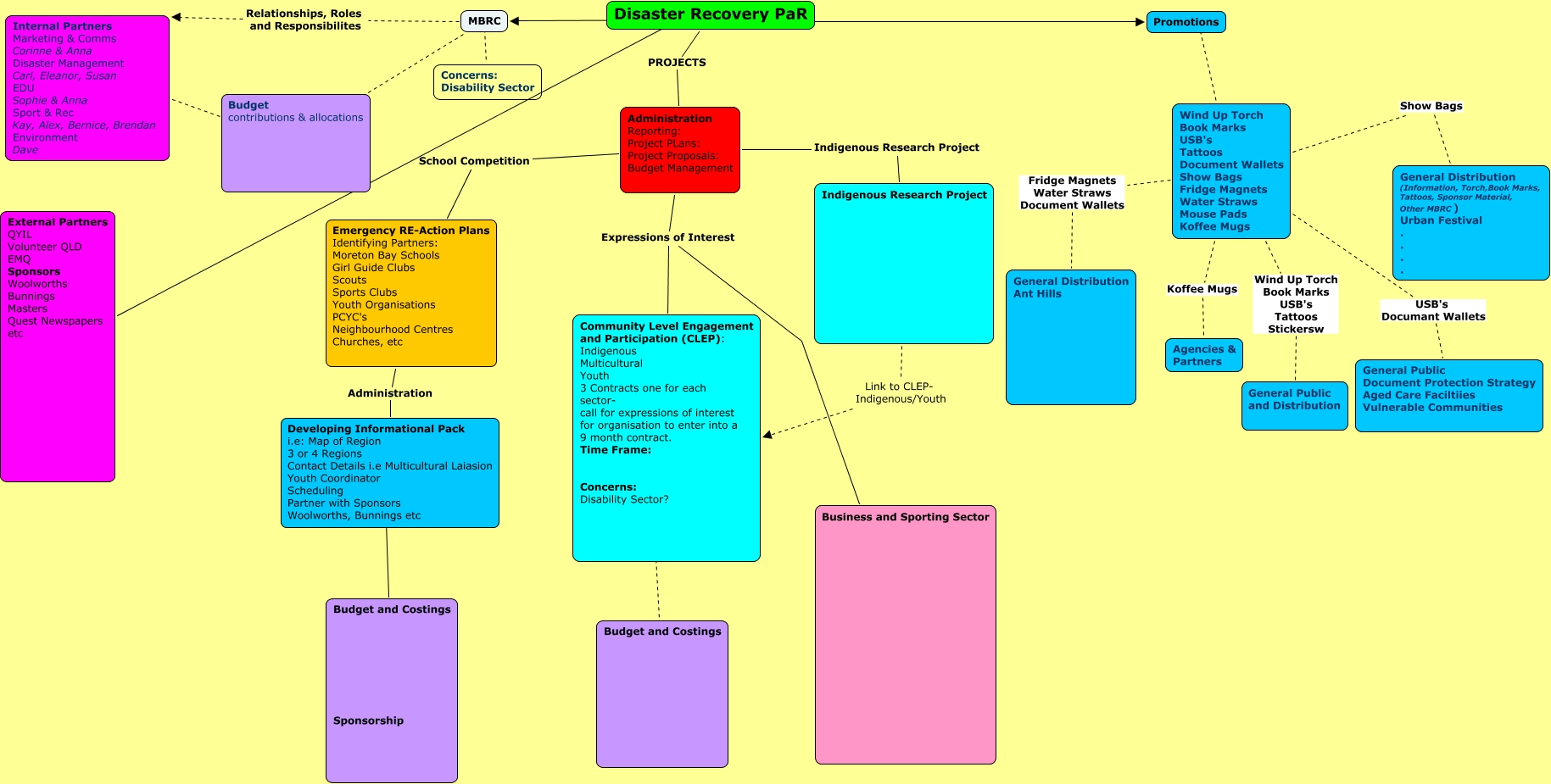 This Concept Map, created with IHMC CmapTools, has information related to: Disaster Redovery PaR, Administration Reporting: Project PLans: Project Proposals: Budget Management School Competition Emergency RE-Action Plans Identifying Partners: Moreton Bay Schools Girl Guide Clubs Scouts Sports Clubs Youth Organisations PCYC's Neighbourhood Centres Churches, etc, Indigenous Research Project Link to CLEP- Indigenous/Youth Community Level Engagement and Participation (CLEP): Indigenous Multicultural Youth 3 Contracts one for each sector- call for expressions of interest for organisation to enter into a 9 month contract. Time Frame: Concerns: Disability Sector?, Disaster Recovery PaR ???? MBRC, Administration Reporting: Project PLans: Project Proposals: Budget Management Expressions of Interest Business and Sporting Sector, Budget contributions & allocations ???? Internal Partners Marketing & Comms Corinne & Anna Disaster Management Carl, Eleanor, Susan EDU Sophie & Anna Sport & Rec Kay, Alex, Bernice, Brendan Environment Dave, Wind Up Torch Book Marks USB's Tattoos Document Wallets Show Bags Fridge Magnets Water Straws Mouse Pads Koffee Mugs Koffee Mugs Agencies & Partners, MBRC Relationships, Roles and Responsibilites Internal Partners Marketing & Comms Corinne & Anna Disaster Management Carl, Eleanor, Susan EDU Sophie & Anna Sport & Rec Kay, Alex, Bernice, Brendan Environment Dave, Wind Up Torch Book Marks USB's Tattoos Document Wallets Show Bags Fridge Magnets Water Straws Mouse Pads Koffee Mugs USB's Documant Wallets General Public Document Protection Strategy Aged Care Faciltiies Vulnerable Communities, MBRC ???? Budget contributions & allocations, Developing Informational Pack i.e: Map of Region 3 or 4 Regions Contact Details i.e Multicultural Laiasion Youth Coordinator Scheduling Partner with Sponsors Woolworths, Bunnings etc ???? Budget and Costings Sponsorship, Community Level Engagement and Participation (CLEP): Indigenous Multicultural Youth 3 Contracts one for each sector- call for expressions of interest for organisation to enter into a 9 month contract. Time Frame: Concerns: Disability Sector? ???? Budget and Costings, Disaster Recovery PaR PROJECTS Administration Reporting: Project PLans: Project Proposals: Budget Management, Wind Up Torch Book Marks USB's Tattoos Document Wallets Show Bags Fridge Magnets Water Straws Mouse Pads Koffee Mugs Fridge Magnets Water Straws Document Wallets General Distribution Ant Hills, Administration Reporting: Project PLans: Project Proposals: Budget Management Expressions of Interest Community Level Engagement and Participation (CLEP): Indigenous Multicultural Youth 3 Contracts one for each sector- call for expressions of interest for organisation to enter into a 9 month contract. Time Frame: Concerns: Disability Sector?, Disaster Recovery PaR ???? Promotions, Wind Up Torch Book Marks USB's Tattoos Document Wallets Show Bags Fridge Magnets Water Straws Mouse Pads Koffee Mugs Show Bags General Distribution (Information, Torch,Book Marks, Tattoos, Sponsor Material, Other MBRC) Urban Festival . . . ., Wind Up Torch Book Marks USB's Tattoos Document Wallets Show Bags Fridge Magnets Water Straws Mouse Pads Koffee Mugs Wind Up Torch Book Marks USB's Tattoos Stickersw General Public and Distribution, Disaster Recovery PaR ???? External Partners QYIL Volunteer QLD EMQ Sponsors Woolworths Bunnings Masters Quest Newspapers etc, Promotions ???? Wind Up Torch Book Marks USB's Tattoos Document Wallets Show Bags Fridge Magnets Water Straws Mouse Pads Koffee Mugs, Emergency RE-Action Plans Identifying Partners: Moreton Bay Schools Girl Guide Clubs Scouts Sports Clubs Youth Organisations PCYC's Neighbourhood Centres Churches, etc Administration Developing Informational Pack i.e: Map of Region 3 or 4 Regions Contact Details i.e Multicultural Laiasion Youth Coordinator Scheduling Partner with Sponsors Woolworths, Bunnings etc