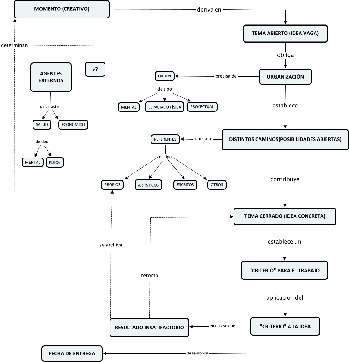 Este Cmap, tiene información relacionada con: Mapa Conceptual, "CRITERIO" PARA EL TRABAJO aplicacion del "CRITERIO" A LA IDEA, MOMENTO (CREATIVO) deriva en TEMA ABIERTO (IDEA VAGA), REFERENTES de tipo ESCRITOS, "CRITERIO" A LA IDEA desemboca FECHA DE ENTREGA, TEMA ABIERTO (IDEA VAGA) obliga ORGANIZACIÓN, ORGANIZACIÓN precisa de ORDEN, REFERENTES de tipo PROPIOS, SALUD de tipo FÍSICA, SALUD de tipo MENTAL, ORDEN de tipo PROYECTUAL, AGENTES EXTERNOS de caracter ECONOMICO, REFERENTES de tipo ARTÍSTICOS, RESULTADO INSATIFACTORIO se archiva PROPIOS, AGENTES EXTERNOS determinan MOMENTO (CREATIVO), ORDEN de tipo MENTAL, AGENTES EXTERNOS de caracter SALUD, FECHA DE ENTREGA determinan MOMENTO (CREATIVO), ORGANIZACIÓN establece DISTINTOS CAMINOS(POSIBILIDADES ABIERTAS), RESULTADO INSATIFACTORIO retomo TEMA CERRADO (IDEA CONCRETA), TEMA CERRADO (IDEA CONCRETA) establece un "CRITERIO" PARA EL TRABAJO