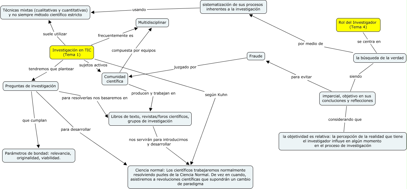Este Cmap, tiene información relacionada con: Mapa conceptual asignatura MIN.cmap, la búsqueda de la verdad siendo imparcial, objetivo en sus concluciones y reflecciones, Investigación en TIC (Tema 1) sujetos activos Comunidad científica, imparcial, objetivo en sus concluciones y reflecciones considerando que la objetividad es relativa: la percepción de la realidad que tiene el investigador influye en algún momento en el proceso de investigación, Libros de texto, revistas/foros científicos, grupos de investigación nos servirán para introducirnos y desarrollar Ciencia normal: Los científicos trabajaremos normalmente resolviendo puzles de la Ciencia Normal. De vez en cuando, asistiremos a revoluciones científicas que supondrán un cambio de paradigma, Investigación en TIC (Tema 1) suele utilizar Técnicas mixtas (cualitativas y cuantitativas) y no siempre método científico estricto, Preguntas de investigación para desarrollar Ciencia normal: Los científicos trabajaremos normalmente resolviendo puzles de la Ciencia Normal. De vez en cuando, asistiremos a revoluciones científicas que supondrán un cambio de paradigma, Comunidad científica producen y trabajan en Libros de texto, revistas/foros científicos, grupos de investigación, Rol del Investigador (Tema 4) se centra en la búsqueda de la verdad, Investigación en TIC (Tema 1) frecuentemente es Multidisciplinar, Investigación en TIC (Tema 1) tendremos que plantear Preguntas de investigación, Investigación en TIC (Tema 1) según Kuhn Ciencia normal: Los científicos trabajaremos normalmente resolviendo puzles de la Ciencia Normal. De vez en cuando, asistiremos a revoluciones científicas que supondrán un cambio de paradigma, la búsqueda de la verdad por medio de sistematización de sus procesos inherentes a la investigación, imparcial, objetivo en sus concluciones y reflecciones para evitar Fraude, Preguntas de investigación para resolverlas nos basaremos en Libros de texto, revistas/foros científicos, grupos de investigación, Fraude juzgado por Comunidad científica, Comunidad científica compuesta por equipos Multidisciplinar, sistematización de sus procesos inherentes a la investigación usando Técnicas mixtas (cualitativas y cuantitativas) y no siempre método científico estricto, Preguntas de investigación que cumplan Parámetros de bondad: relevancia, originalidad, viabilidad.