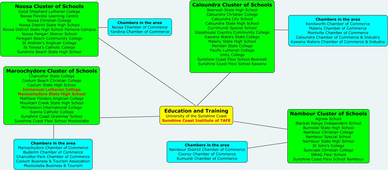 This Concept Map, created with IHMC CmapTools, has information related to: Purpose and School Clusters, Caloundra Cluster of Schools Beerwah State High School Caloundra Christian College Caloundra City School Caloundra State High School Currimundi Special School Glasshouse Country Community College Kawana Waters State College Maleny State High School Meridan State College Pacific Lutheran College Unity College Sunshine Coast Flexi School Beerwah Sunshine Coast Flexi School Kawana ???? Chambers in the area Kenilworth Chamber of Commerce Maleny Chamber of Commerce Montville Chamber of Commerce Caloundra Chamber of Commerce & Industry Kawana Waters Chamber of Commerce & Industry, Maroochydore Cluster of Schools Chancellor State College Coolum Beach Christian College Coolum State High School Immanuel Lutheran College Maroochydore State High School Matthew Flinders Anglican College Mountain Creek State High School Montessori International College Sienna Catholic College Sunshine Coast Grammar School Sunshine Coast Flexi School Mooloolaba ???? Chambers in the area Maroochydore Chamber of Commerce Buderim Chamber of Commerce Chancellor Park Chamber of Commerce Coolum Business & Tourism Association Mooloolaba Business & Tourism, Caloundra Cluster of Schools Beerwah State High School Caloundra Christian College Caloundra City School Caloundra State High School Currimundi Special School Glasshouse Country Community College Kawana Waters State College Maleny State High School Meridan State College Pacific Lutheran College Unity College Sunshine Coast Flexi School Beerwah Sunshine Coast Flexi School Kawana ???? Education and Training University of the Sunshine Coast Sunshine Coast Institute of TAFE, Nambour Cluster of Schools Agnew School Blackall Range Independent School Burnside State High School Nambour Christian College Nambour Special School Nambour State High School St John's College Suncoast Christian College SWAG Flexi School Sunshine Coast Flexi School Nambour ???? Education and Training University of the Sunshine Coast Sunshine Coast Institute of TAFE, Noosa Cluster of Schools Good Shepherd Lutheran College Noosa Flexible Learning Centre Noosa Christian College Noosa District State High School Noosa District State High School Pamona Campus Noosa Pengari Steiner School Peregian Beach Community College St Andrew's Anglican College St Teresa's Catholic College Sunshine Beach State High School ???? Education and Training University of the Sunshine Coast Sunshine Coast Institute of TAFE, Noosa Cluster of Schools Good Shepherd Lutheran College Noosa Flexible Learning Centre Noosa Christian College Noosa District State High School Noosa District State High School Pamona Campus Noosa Pengari Steiner School Peregian Beach Community College St Andrew's Anglican College St Teresa's Catholic College Sunshine Beach State High School ???? Chambers in the area Noosa Chamber of Commerce Yandina Chamber of Commerce, Maroochydore Cluster of Schools Chancellor State College Coolum Beach Christian College Coolum State High School Immanuel Lutheran College Maroochydore State High School Matthew Flinders Anglican College Mountain Creek State High School Montessori International College Sienna Catholic College Sunshine Coast Grammar School Sunshine Coast Flexi School Mooloolaba ???? Education and Training University of the Sunshine Coast Sunshine Coast Institute of TAFE, Nambour Cluster of Schools Agnew School Blackall Range Independent School Burnside State High School Nambour Christian College Nambour Special School Nambour State High School St John's College Suncoast Christian College SWAG Flexi School Sunshine Coast Flexi School Nambour ???? Chambers in the area Nambour District Chamber of Commerce Cooroy Chamber of Commerce Eumundi Chamber of Commerce