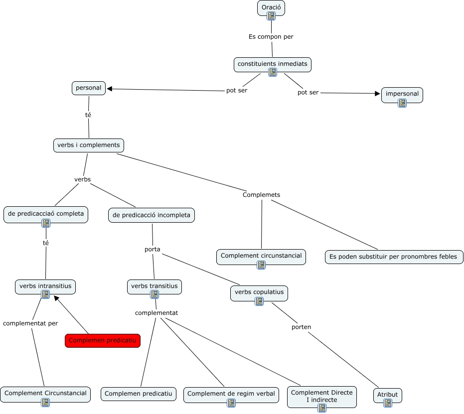 Aquest mapa conceptual conté informació relacionada amb: Sintaxis, verbs transitius complementat Complement Directe I indirecte, verbs transitius complementat Complemen predicatiu, verbs i complements Complemets Es poden substituir per pronombres febles, constituients inmediats pot ser personal, de predicacció incompleta porta verbs copulatius, de predicacciaó completa té verbs intransitius, de predicacció incompleta porta verbs transitius, verbs i complements verbs de predicacció incompleta, verbs copulatius porten Atribut, verbs transitius complementat Complement de regim verbal, personal té verbs i complements, verbs i complements Complemets Complement circunstancial, Oració Es compon per constituients inmediats, Complemen predicatiu ???? verbs intransitius, constituients inmediats pot ser impersonal, verbs i complements verbs de predicacciaó completa, verbs intransitius complementat per Complement Circunstancial