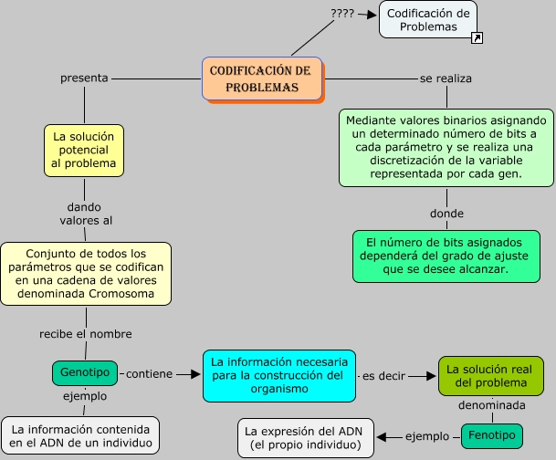 Este Cmap, tiene información relacionada con: codificación de problemas, La solución real del problema denominada Fenotipo, La solución potencial al problema dando valores al Conjunto de todos los parámetros que se codifican en una cadena de valores denominada Cromosoma, Codificación de Problemas se realiza Mediante valores binarios asignando un determinado número de bits a cada parámetro y se realiza una discretización de la variable representada por cada gen., Fenotipo ejemplo La expresión del ADN (el propio individuo), Mediante valores binarios asignando un determinado número de bits a cada parámetro y se realiza una discretización de la variable representada por cada gen. donde El número de bits asignados dependerá del grado de ajuste que se desee alcanzar., Codificación de Problemas ???? Codificación de Problemas, La información necesaria para la construcción del organismo es decir La solución real del problema, Genotipo ejemplo La información contenida en el ADN de un individuo, Genotipo contiene La información necesaria para la construcción del organismo, Codificación de Problemas presenta La solución potencial al problema, Conjunto de todos los parámetros que se codifican en una cadena de valores denominada Cromosoma recibe el nombre Genotipo