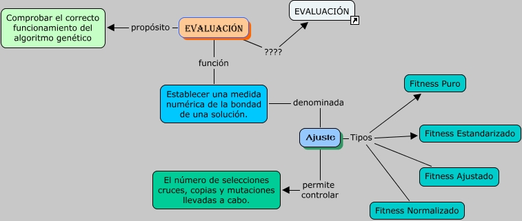 Este Cmap, tiene información relacionada con: evaluación, EVALUACIÓN ???? EVALUACIÓN, Ajuste Tipos Fitness Ajustado, Ajuste permite controlar El número de selecciones cruces, copias y mutaciones llevadas a cabo., Ajuste Tipos Fitness Estandarizado, EVALUACIÓN propósito Comprobar el correcto funcionamiento del algoritmo genético, Ajuste Tipos Fitness Normalizado, EVALUACIÓN función Establecer una medida numérica de la bondad de una solución., Establecer una medida numérica de la bondad de una solución. denominada Ajuste, Ajuste Tipos Fitness Puro