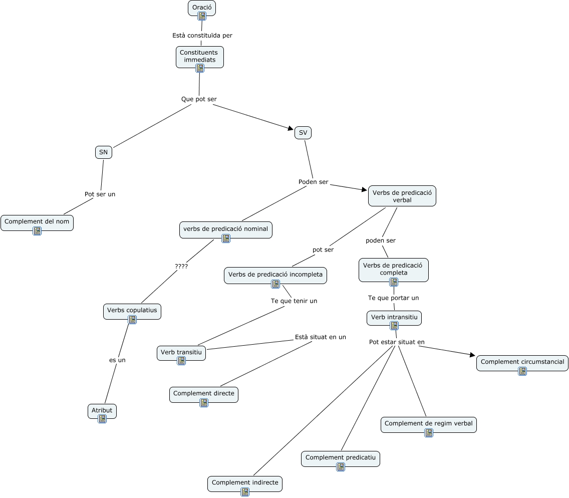 Aquest mapa conceptual conté informació relacionada amb: SINTAXI, Verbs de predicació completa Te que portar un Verb intransitiu, Constituents immediats Que pot ser SN, Verbs copulatius es un Atribut, Verb transitiu Està situat en un Complement directe, SV Poden ser Verbs de predicació verbal, Verbs de predicació verbal pot ser Verbs de predicació incompleta, Verbs de predicació incompleta Te que tenir un Verb transitiu, verbs de predicació nominal ???? Verbs copulatius, Verb intransitiu Pot estar situat en Complement indirecte, SV Poden ser verbs de predicació nominal, Oració Està constituïda per Constituents immediats, Verb intransitiu Pot estar situat en Complement predicatiu, Verbs de predicació verbal poden ser Verbs de predicació completa, Verb intransitiu Pot estar situat en Complement de regim verbal, Constituents immediats Que pot ser SV, SN Pot ser un Complement del nom, Verb intransitiu Pot estar situat en Complement circumstancial