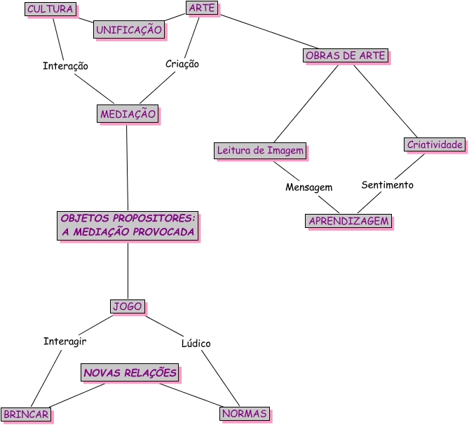 Esse mapa conceitual, produzido no IHMC CmapTools, tem a informação relacionada a: Objetos propositores, NOVAS RELAÇÕES ???? BRINCAR, OBJETOS PROPOSITORES: A MEDIAÇÃO PROVOCADA ???? MEDIAÇÃO, CULTURA Interação MEDIAÇÃO, Criatividade Sentimento APRENDIZAGEM, ARTE ???? UNIFICAÇÃO, OBRAS DE ARTE ???? Leitura de Imagem, JOGO Lúdico NORMAS, ARTE Criação MEDIAÇÃO, JOGO Interagir BRINCAR, CULTURA ???? UNIFICAÇÃO, Leitura de Imagem Mensagem APRENDIZAGEM, ARTE ???? OBRAS DE ARTE, NOVAS RELAÇÕES ???? NORMAS, OBJETOS PROPOSITORES: A MEDIAÇÃO PROVOCADA ???? JOGO, OBRAS DE ARTE ???? Criatividade