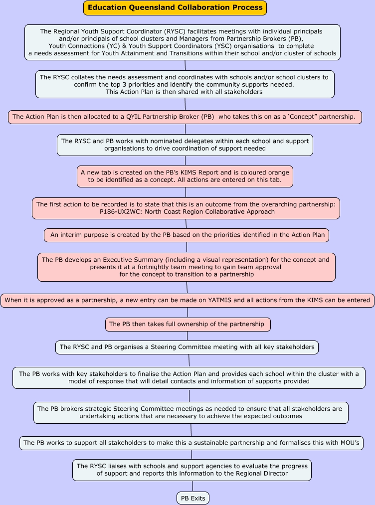 This Concept Map, created with IHMC CmapTools, has information related to: Education Queensland Collaboration Process, The RYSC liaises with schools and support agencies to evaluate the progress of support and reports this information to the Regional Director ???? PB Exits, The RYSC and PB organises a Steering Committee meeting with all key stakeholders ???? The PB works with key stakeholders to finalise the Action Plan and provides each school within the cluster with a model of response that will detail contacts and information of supports provided, An interim purpose is created by the PB based on the priorities identified in the Action Plan ???? The PB develops an Executive Summary (including a visual representation) for the concept and presents it at a fortnightly team meeting to gain team approval for the concept to transition to a partnership, The PB works with key stakeholders to finalise the Action Plan and provides each school within the cluster with a model of response that will detail contacts and information of supports provided ???? The PB brokers strategic Steering Committee meetings as needed to ensure that all stakeholders are undertaking actions that are necessary to achieve the expected outcomes, The Regional Youth Support Coordinator (RYSC) facilitates meetings with individual principals and/or principals of school clusters and Managers from Partnership Brokers (PB), Youth Connections (YC) & Youth Support Coordinators (YSC) organisations to complete a needs assessment for Youth Attainment and Transitions within their school and/or cluster of schools ???? The RYSC collates the needs assessment and coordinates with schools and/or school clusters to confirm the top 3 priorities and identify the community supports needed. This Action Plan is then shared with all stakeholders, The PB works to support all stakeholders to make this a sustainable partnership and formalises this with MOU’s ???? The RYSC liaises with schools and support agencies to evaluate the progress of support and reports this information to the Regional Director, The first action to be recorded is to state that this is an outcome from the overarching partnership: P186-UX2WC: North Coast Region Collaborative Approach ???? An interim purpose is created by the PB based on the priorities identified in the Action Plan, A new tab is created on the PB’s KIMS Report and is coloured orange to be identified as a concept. All actions are entered on this tab. ???? The first action to be recorded is to state that this is an outcome from the overarching partnership: P186-UX2WC: North Coast Region Collaborative Approach, The Action Plan is then allocated to a QYIL Partnership Broker (PB) who takes this on as a ‘Concept” partnership. ???? The RYSC and PB works with nominated delegates within each school and support organisations to drive coordination of support needed, The PB brokers strategic Steering Committee meetings as needed to ensure that all stakeholders are undertaking actions that are necessary to achieve the expected outcomes ???? The PB works to support all stakeholders to make this a sustainable partnership and formalises this with MOU’s, The RYSC and PB works with nominated delegates within each school and support organisations to drive coordination of support needed ???? A new tab is created on the PB’s KIMS Report and is coloured orange to be identified as a concept. All actions are entered on this tab., The PB develops an Executive Summary (including a visual representation) for the concept and presents it at a fortnightly team meeting to gain team approval for the concept to transition to a partnership ???? When it is approved as a partnership, a new entry can be made on YATMIS and all actions from the KIMS can be entered, The RYSC collates the needs assessment and coordinates with schools and/or school clusters to confirm the top 3 priorities and identify the community supports needed. This Action Plan is then shared with all stakeholders ???? The Action Plan is then allocated to a QYIL Partnership Broker (PB) who takes this on as a ‘Concept” partnership., When it is approved as a partnership, a new entry can be made on YATMIS and all actions from the KIMS can be entered ???? The PB then takes full ownership of the partnership, The PB then takes full ownership of the partnership ???? The RYSC and PB organises a Steering Committee meeting with all key stakeholders
