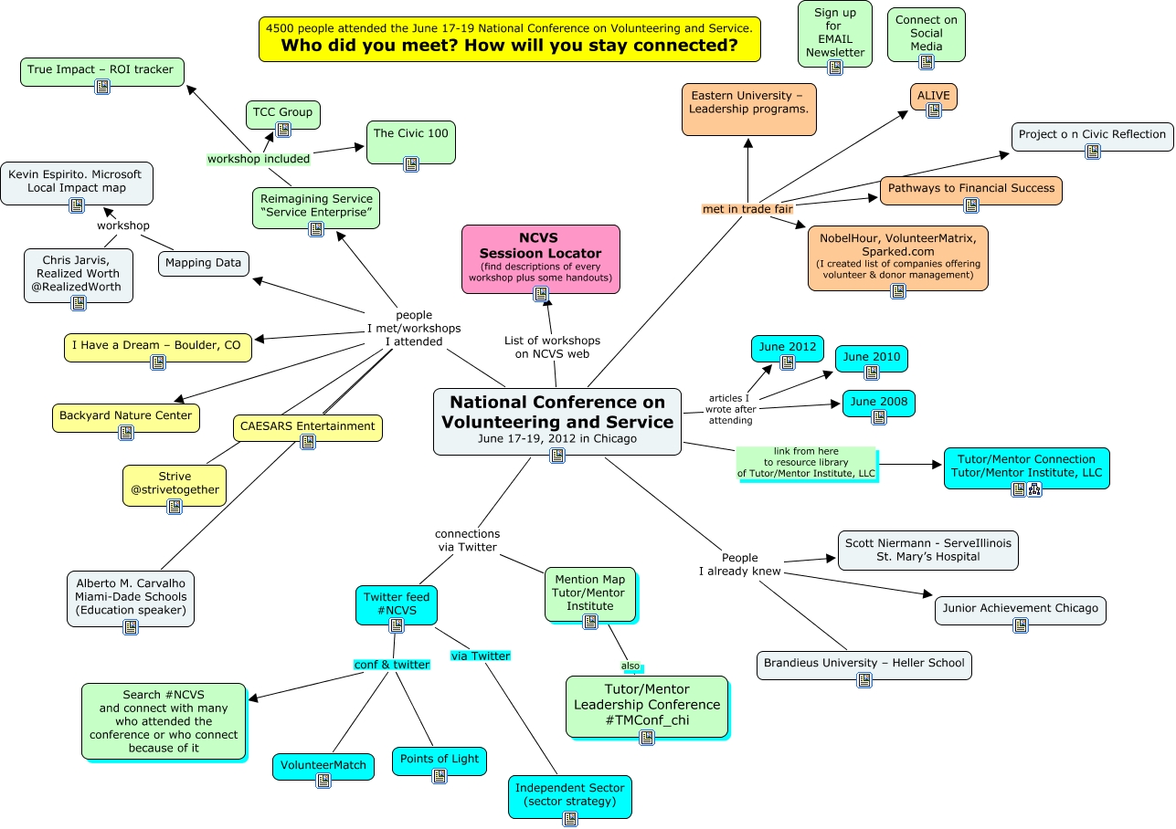 This Concept Map, created with IHMC CmapTools, has information related to: NCVS 2012, National Conference on Volunteering and Service June 17-19, 2012 in Chicago people I met/workshops I attended Strive @strivetogether, National Conference on Volunteering and Service June 17-19, 2012 in Chicago met in trade fair Project o n Civic Reflection, Mapping Data workshop Chris Jarvis, Realized Worth @RealizedWorth, National Conference on Volunteering and Service June 17-19, 2012 in Chicago link from here to resource library of Tutor/Mentor Institute, LLC Tutor/Mentor Connection Tutor/Mentor Institute, LLC, National Conference on Volunteering and Service June 17-19, 2012 in Chicago articles I wrote after attending June 2008, National Conference on Volunteering and Service June 17-19, 2012 in Chicago People I already knew Junior Achievement Chicago, National Conference on Volunteering and Service June 17-19, 2012 in Chicago met in trade fair Eastern University – Leadership programs., Twitter feed #NCVS via Twitter Independent Sector (sector strategy), National Conference on Volunteering and Service June 17-19, 2012 in Chicago people I met/workshops I attended Reimagining Service “Service Enterprise”, Mention Map Tutor/Mentor Institute also Tutor/Mentor Leadership Conference #TMConf_chi, National Conference on Volunteering and Service June 17-19, 2012 in Chicago articles I wrote after attending June 2010, Reimagining Service “Service Enterprise” workshop included True Impact – ROI tracker, National Conference on Volunteering and Service June 17-19, 2012 in Chicago connections via Twitter Mention Map Tutor/Mentor Institute, National Conference on Volunteering and Service June 17-19, 2012 in Chicago people I met/workshops I attended I Have a Dream – Boulder, CO, Reimagining Service “Service Enterprise” workshop included TCC Group, Twitter feed #NCVS conf & twitter VolunteerMatch, National Conference on Volunteering and Service June 17-19, 2012 in Chicago People I already knew Scott Niermann - ServeIllinois St. Mary’s Hospital, National Conference on Volunteering and Service June 17-19, 2012 in Chicago met in trade fair NobelHour, VolunteerMatrix, Sparked.com (I created list of companies offering volunteer & donor management), National Conference on Volunteering and Service June 17-19, 2012 in Chicago people I met/workshops I attended Mapping Data, National Conference on Volunteering and Service June 17-19, 2012 in Chicago met in trade fair Pathways to Financial Success