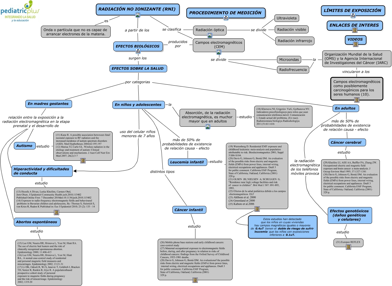 Este Cmap, tiene información relacionada con: RADIACIÓN NO IONIZANTE (RNI), En niños y adolescentes distintos tipos Cáncer infantil, Radiofrecuencia la Organización Mundial de la Salud (OMS) y la Agencia Internacional de Investigaiones del Cáncer (IARC), Cáncer cerebral estudio (29) Kheifets LI, Afifi AA, Buffler PA, Zhang ZW. Occupational electric and magnetic field exposure and brain cancer: a meta-analysis. J Occup Environ Med 1995; 37:1327-1341 (30) Davis G, Johnson G, Bontá DM. An evaluation of the possible risks from electric and magnetic fields (EMFs) from power lines, internal wiring, electrical occupations and appliances. Draft 3 for public comment. California EMF Program, State of California, Oakland, California (2001) 329 p., Campos electromagnéticos (CEM) se divide Radiofrecuencia, RADIACIÓN NO IONIZANTE (RNI) se clasifica Radiación óptica, En adultos más de 50% de probabilidades de existencia de relación causa - efecto Cáncer cerebral, En madres gestantes por categorias En niños y adolescentes, En niños y adolescentes la Absorción, de la radiación electromagnética, es muchor mayor que en adultos, Autismo estudio (11) Kane R. A possible association betwween fetal/ neonatal esposare to RF radiation and the increased incidence of autism spectrum disorders (ASD). Med Hyphotheses 2004;62:195-197 (12) Mariea TJ, Carlo GL. Wireless radiation in the etiology and treatment of autism: Clinical observations and mechanisms .J Aust Coll Nutr Env Med 2007; 26(2):3-7, Radiación óptica se divide Radiación visible, Absorción, de la radiación electromagnética, es muchor mayor que en adultos estudio (18) Khorseva NI, Grigoriev YuG, Gorbunova NV. Indicadores psicofisiológicos para niños que usan comunicación telefónica móvil. Comunicación I. Estado actual del problema. (En ruso). Radiatsionnaia biologiya Radioekologiya 2011;51:611-616, En madres gestantes relación entre la exposición a la radiación electromagnética en la etapa prenatal y el desarrollo de Hiperactividad y dificultades de conducta, Efectos genotóxicos (daños genéticos y celulares) estudio (31) Europeo REFLEX, En niños y adolescentes uso del celular niños menores de 7 años Hiperactividad y dificultades de conducta, RADIACIÓN NO IONIZANTE (RNI) se clasifica Campos electromagnéticos (CEM), En madres gestantes por categorias En adultos, Abortos espontáneos estudio (15) Lee GM, Neutra RR, Hristova L, Yost M, Hiatt RA. The use of electric bed heaters and the risk of clinically recognized spontaneous abortion. Epidemiology 2000; 11:406-415 (16) Lee GM, Neutra RR, Hristova L, Yost M, Hiatt RA.. A nested case-control study of residential and personal magnetic field measures and miscarriages. Epidemiology 2002; 13:21-31 (17) Li DK, Odouli R, Wi S, Janevic T, Golditch I, Bracken TD, Senior R, Rankin R, Iriye R. A populationbased prospective cohort study of personal exposure to magnetic fields during pregnancy and the risk of miscarrieage. Epidemiology 2002; 13:9-20, En madres gestantes relación entre la exposición a la radiación electromagnética en la etapa prenatal y el desarrollo de Autismo, Cáncer infantil estudio (26) Mobile phone base stations and early childhood cancers: case-control study (27) Maternal occupational exposure to electromagnetic fields before, during, and after pregnancy in relation to risks of childhood cancers: findings from the Oxford Survey of Childhood Cancers, 1953-1981 deaths. (28) Davis G, Johnson G, Bontá DM. An evaluationof the possible risks from electric and magnetic fields (EMFs) from power lines, internal wiring, electrical occupations and appliances. Draft 3 for public comment. California EMF Program, State of California, Oakland, California (2001) 329 p., Organización Mundial de la Salud (OMS) y la Agencia Internacional de Investigaiones del Cáncer (IARC) vincularon a los Campos electromagnéticos como posiblemente carcinogénicos para los seres humanos (10).