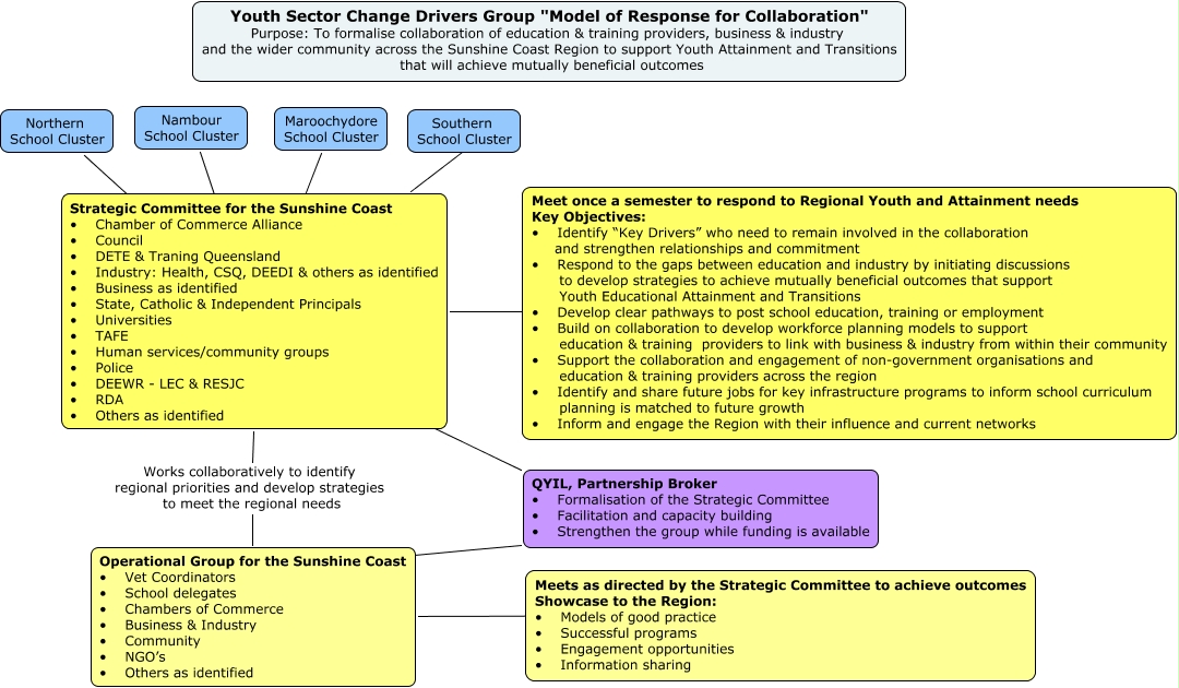This Concept Map, created with IHMC CmapTools, has information related to: YSCDG Model of Response for Collaboration, Strategic Committee for the Sunshine Coast • Chamber of Commerce Alliance • Council • DETE & Traning Queensland • Industry: Health, CSQ, DEEDI & others as identified • Business as identified • State, Catholic & Independent Principals • Universities • TAFE • Human services/community groups • Police • DEEWR - LEC & RESJC • RDA • Others as identified ???? Nambour School Cluster, Strategic Committee for the Sunshine Coast • Chamber of Commerce Alliance • Council • DETE & Traning Queensland • Industry: Health, CSQ, DEEDI & others as identified • Business as identified • State, Catholic & Independent Principals • Universities • TAFE • Human services/community groups • Police • DEEWR - LEC & RESJC • RDA • Others as identified ???? Northern School Cluster, Strategic Committee for the Sunshine Coast • Chamber of Commerce Alliance • Council • DETE & Traning Queensland • Industry: Health, CSQ, DEEDI & others as identified • Business as identified • State, Catholic & Independent Principals • Universities • TAFE • Human services/community groups • Police • DEEWR - LEC & RESJC • RDA • Others as identified ???? Southern School Cluster, Strategic Committee for the Sunshine Coast • Chamber of Commerce Alliance • Council • DETE & Traning Queensland • Industry: Health, CSQ, DEEDI & others as identified • Business as identified • State, Catholic & Independent Principals • Universities • TAFE • Human services/community groups • Police • DEEWR - LEC & RESJC • RDA • Others as identified ???? Meet once a semester to respond to Regional Youth and Attainment needs Key Objectives: • Identify “Key Drivers” who need to remain involved in the collaboration and strengthen relationships and commitment • Respond to the gaps between education and industry by initiating discussions to develop strategies to achieve mutually beneficial outcomes that support Youth Educational Attainment and Transitions • Develop clear pathways to post school education, training or employment • Build on collaboration to develop workforce planning models to support education & training providers to link with business & industry from within their community • Support the collaboration and engagement of non-government organisations and education & training providers across the region • Identify and share future jobs for key infrastructure programs to inform school curriculum planning is matched to future growth • Inform and engage the Region with their influence and current networks, Strategic Committee for the Sunshine Coast • Chamber of Commerce Alliance • Council • DETE & Traning Queensland • Industry: Health, CSQ, DEEDI & others as identified • Business as identified • State, Catholic & Independent Principals • Universities • TAFE • Human services/community groups • Police • DEEWR - LEC & RESJC • RDA • Others as identified ???? QYIL, Partnership Broker • Formalisation of the Strategic Committee • Facilitation and capacity building • Strengthen the group while funding is available, Strategic Committee for the Sunshine Coast • Chamber of Commerce Alliance • Council • DETE & Traning Queensland • Industry: Health, CSQ, DEEDI & others as identified • Business as identified • State, Catholic & Independent Principals • Universities • TAFE • Human services/community groups • Police • DEEWR - LEC & RESJC • RDA • Others as identified ???? Maroochydore School Cluster, QYIL, Partnership Broker • Formalisation of the Strategic Committee • Facilitation and capacity building • Strengthen the group while funding is available ???? Operational Group for the Sunshine Coast • Vet Coordinators • School delegates • Chambers of Commerce • Business & Industry • Community • NGO’s • Others as identified, Operational Group for the Sunshine Coast • Vet Coordinators • School delegates • Chambers of Commerce • Business & Industry • Community • NGO’s • Others as identified ???? Meets as directed by the Strategic Committee to achieve outcomes Showcase to the Region: • Models of good practice • Successful programs • Engagement opportunities • Information sharing, Strategic Committee for the Sunshine Coast • Chamber of Commerce Alliance • Council • DETE & Traning Queensland • Industry: Health, CSQ, DEEDI & others as identified • Business as identified • State, Catholic & Independent Principals • Universities • TAFE • Human services/community groups • Police • DEEWR - LEC & RESJC • RDA • Others as identified Works collaboratively to identify regional priorities and develop strategies to meet the regional needs Operational Group for the Sunshine Coast • Vet Coordinators • School delegates • Chambers of Commerce • Business & Industry • Community • NGO’s • Others as identified