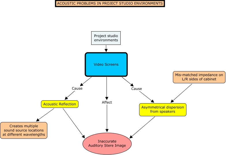This Concept Map, created with IHMC CmapTools, has information related to: Studio Monitoring, Asymmetrical dispersion from speakers Inaccurate Auditory Stere Image, Video Screens Affect Inaccurate Auditory Stere Image, Acoustic Reflection Inaccurate Auditory Stere Image, Mis-matched impedance on L/R sides of cabinet Asymmetrical dispersion from speakers, Video Screens Cause Acoustic Reflection, Acoustic Reflection Creates multiple sound source locations at different wavelengths, Video Screens Cause Asymmetrical dispersion from speakers, Project studio environments Video Screens