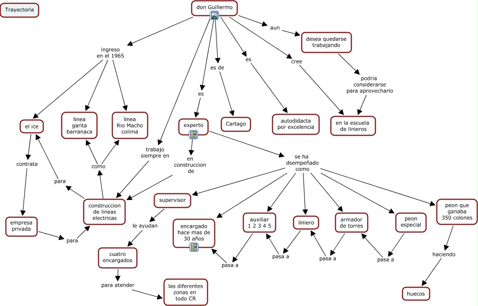 Este Cmap, tiene información relacionada con: AMemoTrayectoria, experto se ha dsempeñado como peon especial, experto se ha dsempeñado como liniero, construccion de lineas electricas como linea Rio Macho colima, don Guillermo trabajo siempre en construccion de lineas electricas, armador de torres pasa a liniero, don Guillermo cree en la escuela de linieros, experto en construccion de construccion de lineas electricas, construccion de lineas electricas para el ice, el ice contrata empresa privada, auxiliar 1 2 3 4 5 pasa a encargado hace mas de 30 años, construccion de lineas electricas como linea garita barranaca, experto se ha dsempeñado como armador de torres, don Guillermo ingreso en el 1965 el ice, desea quedarse trabajando podria considerarse para aprovecharlo en la escuela de linieros, don Guillermo es experto, experto se ha dsempeñado como encargado hace mas de 30 años, cuatro encargados para atender las diferentes zonas en todo CR, don Guillermo ingreso en el 1965 linea Rio Macho colima, experto se ha dsempeñado como auxiliar 1 2 3 4 5, don Guillermo aun desea quedarse trabajando