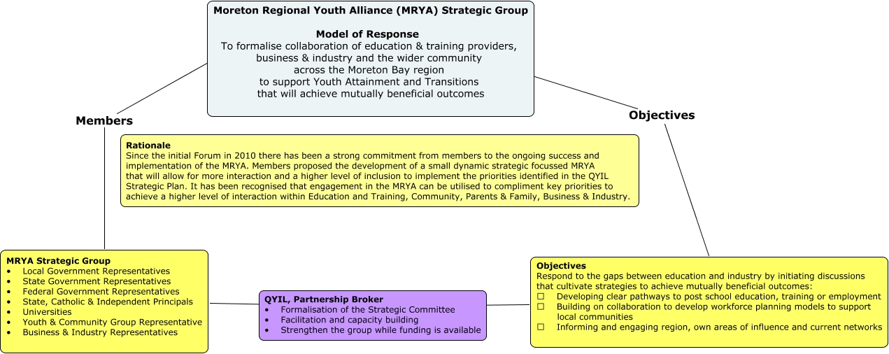This Concept Map, created with IHMC CmapTools, has information related to: MRYA Model of Response for Collaboration, QYIL, Partnership Broker • Formalisation of the Strategic Committee • Facilitation and capacity building • Strengthen the group while funding is available ???? Objectives Respond to the gaps between education and industry by initiating discussions that cultivate strategies to achieve mutually beneficial outcomes: Developing clear pathways to post school education, training or employment Building on collaboration to develop workforce planning models to support local communities Informing and engaging region, own areas of influence and current networks, Moreton Regional Youth Alliance (MRYA) Strategic Group Model of Response To formalise collaboration of education & training providers, business & industry and the wider community across the Moreton Bay region to support Youth Attainment and Transitions that will achieve mutually beneficial outcomes ???? ????, Moreton Regional Youth Alliance (MRYA) Strategic Group Model of Response To formalise collaboration of education & training providers, business & industry and the wider community across the Moreton Bay region to support Youth Attainment and Transitions that will achieve mutually beneficial outcomes ???? ????, QYIL, Partnership Broker • Formalisation of the Strategic Committee • Facilitation and capacity building • Strengthen the group while funding is available ???? MRYA Strategic Group • Local Government Representatives • State Government Representatives • Federal Government Representatives • State, Catholic & Independent Principals • Universities • Youth & Community Group Representative • Business & Industry Representatives, ???? Objectives Objectives Respond to the gaps between education and industry by initiating discussions that cultivate strategies to achieve mutually beneficial outcomes: Developing clear pathways to post school education, training or employment Building on collaboration to develop workforce planning models to support local communities Informing and engaging region, own areas of influence and current networks, ???? Members MRYA Strategic Group • Local Government Representatives • State Government Representatives • Federal Government Representatives • State, Catholic & Independent Principals • Universities • Youth & Community Group Representative • Business & Industry Representatives