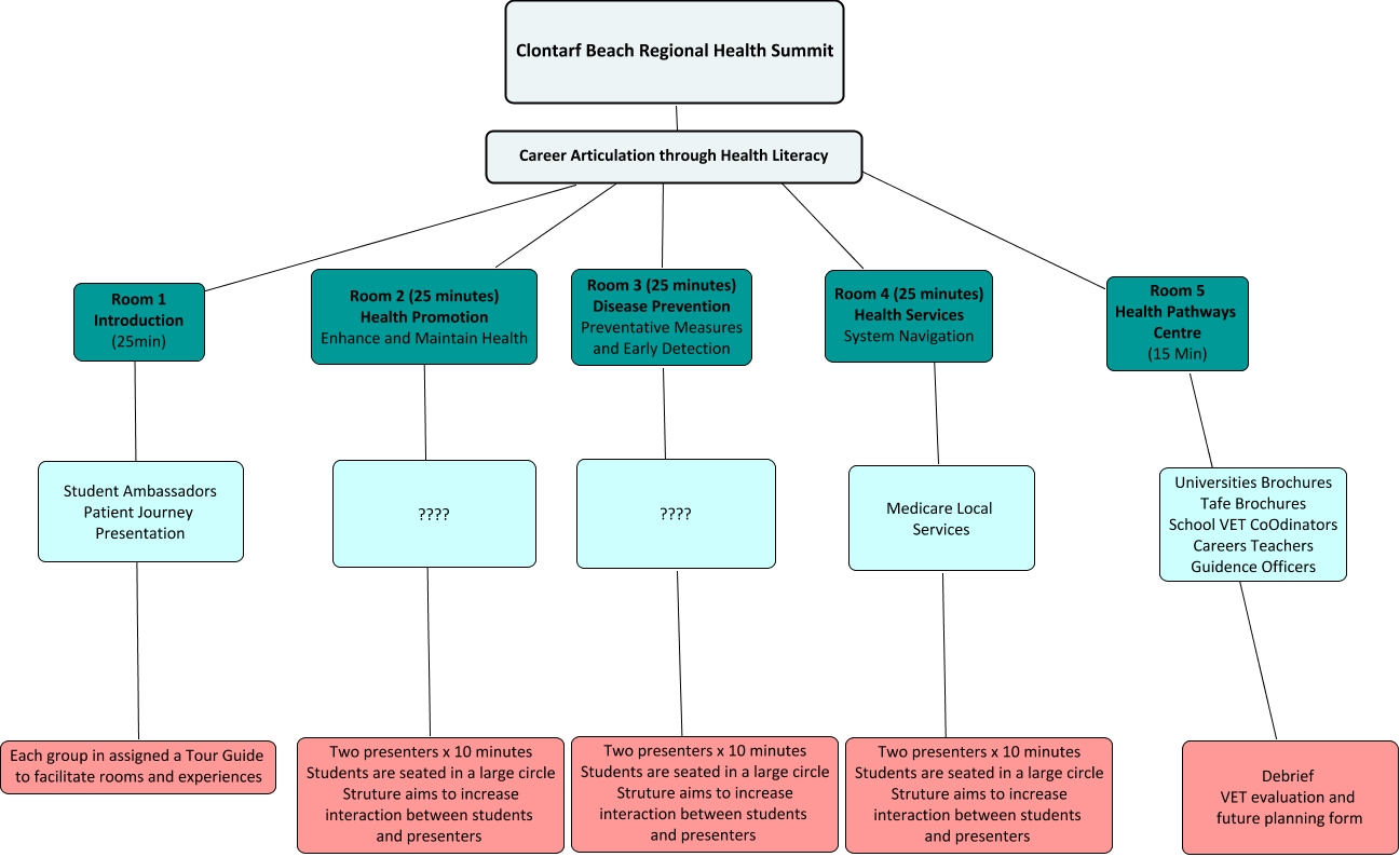 This Concept Map, created with IHMC CmapTools, has information related to: Clontarf Beach Regional Health Summit, Room 4 (25 minutes) Health Services System Navigation ???? Medicare Local Services, Clontarf Beach Regional Health Summit ???? Career Articulation through Health Literacy, Room 3 (25 minutes) Disease Prevention Preventative Measures and Early Detection ???? ????, Each group in assigned a Tour Guide to facilitate rooms and experiences ???? Room 1 Introduction (25min), Room 2 (25 minutes) Health Promotion Enhance and Maintain Health ???? Two presenters x 10 minutes Students are seated in a large circle Struture aims to increase interaction between students and presenters, Room 3 (25 minutes) Disease Prevention Preventative Measures and Early Detection ???? Career Articulation through Health Literacy, Room 4 (25 minutes) Health Services System Navigation ???? Career Articulation through Health Literacy, Career Articulation through Health Literacy ???? Room 1 Introduction (25min), Medicare Local Services ???? Two presenters x 10 minutes Students are seated in a large circle Struture aims to increase interaction between students and presenters, ???? ???? Two presenters x 10 minutes Students are seated in a large circle Struture aims to increase interaction between students and presenters, Room 5 Health Pathways Centre (15 Min) ???? Debrief VET evaluation and future planning form, Room 2 (25 minutes) Health Promotion Enhance and Maintain Health ???? Career Articulation through Health Literacy, Each group in assigned a Tour Guide to facilitate rooms and experiences ???? Room 1 Introduction (25min), Room 3 (25 minutes) Disease Prevention Preventative Measures and Early Detection ???? Career Articulation through Health Literacy, Career Articulation through Health Literacy ???? Room 5 Health Pathways Centre (15 Min)