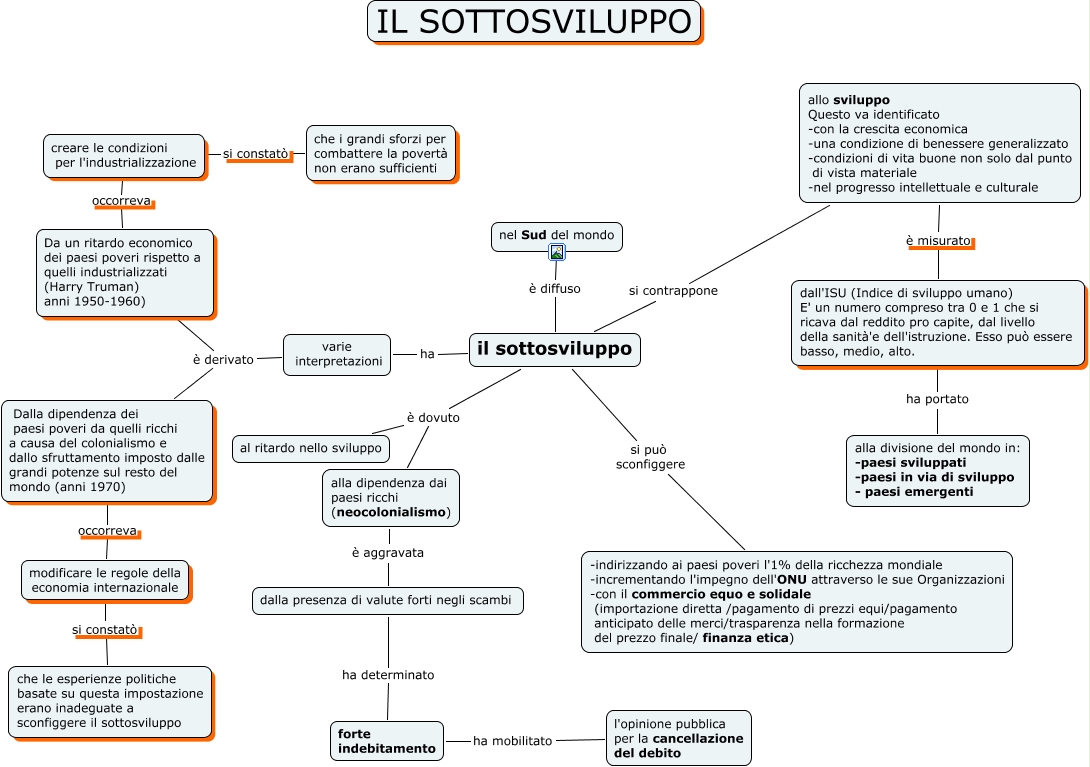 Questa Cmap, creata con IHMC CmapTools, contiene informazioni relative a: Il Sottosviluppo (AA), varie interpretazioni è derivato Da un ritardo economico dei paesi poveri rispetto a quelli industrializzati (Harry Truman) anni 1950-1960), il sottosviluppo è dovuto al ritardo nello sviluppo, allo sviluppo Questo va identificato -con la crescita economica -una condizione di benessere generalizzato -condizioni di vita buone non solo dal punto di vista materiale -nel progresso intellettuale e culturale è misurato dall'ISU (Indice di sviluppo umano) E' un numero compreso tra 0 e 1 che si ricava dal reddito pro capite, dal livello della sanità'e dell'istruzione. Esso può essere basso, medio, alto., Da un ritardo economico dei paesi poveri rispetto a quelli industrializzati (Harry Truman) anni 1950-1960) occorreva creare le condizioni per l'industrializzazione, varie interpretazioni è derivato Dalla dipendenza dei paesi poveri da quelli ricchi a causa del colonialismo e dallo sfruttamento imposto dalle grandi potenze sul resto del mondo (anni 1970), dall'ISU (Indice di sviluppo umano) E' un numero compreso tra 0 e 1 che si ricava dal reddito pro capite, dal livello della sanità'e dell'istruzione. Esso può essere basso, medio, alto. ha portato alla divisione del mondo in: -paesi sviluppati -paesi in via di sviluppo - paesi emergenti, dalla presenza di valute forti negli scambi ha determinato forte indebitamento, il sottosviluppo si contrappone allo sviluppo Questo va identificato -con la crescita economica -una condizione di benessere generalizzato -condizioni di vita buone non solo dal punto di vista materiale -nel progresso intellettuale e culturale, modificare le regole della economia internazionale si constatò che le esperienze politiche basate su questa impostazione erano inadeguate a sconfiggere il sottosviluppo, il sottosviluppo si può sconfiggere -indirizzando ai paesi poveri l'1% della ricchezza mondiale -incrementando l'impegno dell'ONU attraverso le sue Organizzazioni -con il commercio equo e solidale (importazione diretta /pagamento di prezzi equi/pagamento anticipato delle merci/trasparenza nella formazione del prezzo finale/ finanza etica), forte indebitamento ha mobilitato l'opinione pubblica per la cancellazione del debito, il sottosviluppo ha varie interpretazioni, Dalla dipendenza dei paesi poveri da quelli ricchi a causa del colonialismo e dallo sfruttamento imposto dalle grandi potenze sul resto del mondo (anni 1970) occorreva modificare le regole della economia internazionale, creare le condizioni per l'industrializzazione si constatò che i grandi sforzi per combattere la povertà non erano sufficienti, il sottosviluppo è dovuto alla dipendenza dai paesi ricchi (neocolonialismo), il sottosviluppo è diffuso nel Sud del mondo, alla dipendenza dai paesi ricchi (neocolonialismo) è aggravata dalla presenza di valute forti negli scambi