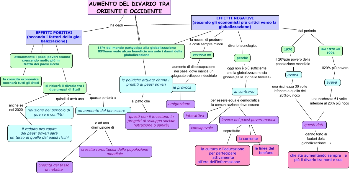 Questa Cmap, creata con IHMC CmapTools, contiene informazioni relative a: aumento del divario tra oriente e occidente, si ridurrà il divario tra i due gruppi di Stati anche se nel 2020 il reddito pro capite dei paesi poveri sarà un terzo di quello dei paesi ricchi, aveva una ricchezza 61 volte inferiore al 20% più ricco questi dati, si ridurrà il divario tra i due gruppi di Stati questo porterà a un aumento del benessere, perchè ???? le politiche attuate danno i prestiti ai paesi poveri, EFFETTI NEGATIVI (secondo gli economisti più critici verso la globalizzazione) dal periodo 1970, al contrario per essere equa e democratica la comunicazione deve essere consapevole, EFFETTI POSITIVI (secondo i fattori della glo- balizzazione) ???? la crescita economica toccherà tutti gli Stati, EFFETTI NEGATIVI (secondo gli economisti più critici verso la globalizzazione) la neces. di produrre a costi sempre minori provoca un, AUMENTO DEL DIVARIO TRA ORIENTE E OCCIDENTE ha degli EFFETTI NEGATIVI (secondo gli economisti più critici verso la globalizzazione), un aumento del benessere e ad una diminuzione di crescita tumultuosa della popolazione mondiale, perchè ???? 15% del mondo partyecipa alla globalizzazione 85%non vede alcun beneficio ma solo i danni della globalizzazione, EFFETTI NEGATIVI (secondo gli economisti più critici verso la globalizzazione) dal periodo dal 1970 all 1991, invece nei paesi poveri manca ???? la corrente, al contrario per essere equa e democratica la comunicazione deve essere invece nei paesi poveri manca, EFFETTI NEGATIVI (secondo gli economisti più critici verso la globalizzazione) divario tecnologico perchè, dal 1970 all 1991 il20% più povero aveva, invece nei paesi poveri manca ???? le linee del telefono, invece nei paesi poveri manca soprattutto la cultura e l'educazione per partecipare attivamente all'era dell'informazione, che provoca ???? emigrazione, aveva una ricchezza 30 volte inferiore a quella del 20%più ricco ????