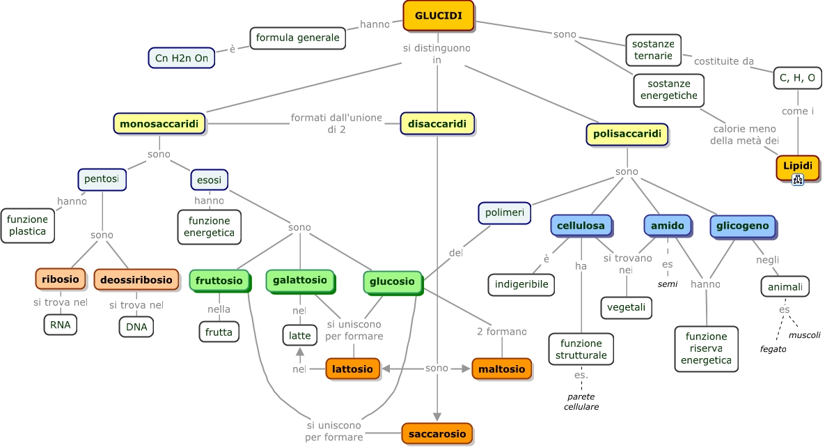 Questa Cmap, creata con IHMC CmapTools, contiene informazioni relative a: Glucidi, polimeri del glucosio, amido si trovano nei cellulosa, glucosio 2 formano maltosio, amido hanno funzione riserva energetica, esosi sono glucosio, fruttosio si uniscono per formare saccarosio, ribosio si trova nel RNA, esosi sono galattosio, pentosi sono ribosio, polisaccaridi sono amido, deossiribosio si trova nel DNA, GLUCIDI si distinguono in polisaccaridi, glucosio si uniscono per formare saccarosio, funzione strutturale es. parete cellulare, amido si trovano nei vegetali, disaccaridi sono lattosio, amido hanno glicogeno, GLUCIDI si distinguono in monosaccaridi, sostanze energetiche calorie meno della metà dei Lipidi, disaccaridi sono maltosio