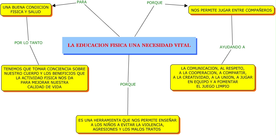Este Cmap, tiene información relacionada con: LA EDUCACION FISICA UNA NECESIDAD VITAL, NOS PERMITE JUGAR ENTRE COMPAÑEROS AYUDANDO A LA COMUNICACION, AL RESPETO, A LA COOPERACION, A COMPARTIR, A LA CREATIVIDAD, A LA UNION, A JUGAR EN EQUIPO Y A FOMENTAR EL JUEGO LIMPIO, LA EDUCACION FISICA UNA NECESIDAD VITAL PORQUE NOS PERMITE JUGAR ENTRE COMPAÑEROS, LA EDUCACION FISICA UNA NECESIDAD VITAL PARA UNA BUENA CONDICION FISICA Y SALUD, LA EDUCACION FISICA UNA NECESIDAD VITAL PORQUE ES UNA HERRAMIENTA QUE NOS PERMITE ENSEÑAR A LOS NIÑOS A EVITAR LA VIOLENCIA, AGRESIONES Y LOS MALOS TRATOS, UNA BUENA CONDICION FISICA Y SALUD POR LO TANTO TENEMOS QUE TOMAR CONCIENCIA SOBRE NUESTRO CUERPO Y LOS BENEFICIOS QUE LA ACTIVIDAD FISICA NOS DA PARA MEJORAR NUESTRA CALIDAD DE VIDA