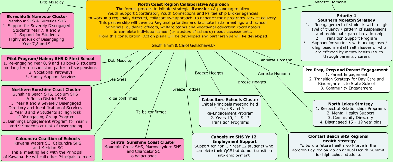 This Concept Map, created with IHMC CmapTools, has information related to: North Coast Region Collaborative Approach January 2013, North Coast Region Collaborative Approach The formal process to initiate strategic discussions & planning to allow Youth Support Coordinator, Youth Connections and Partnership Broker agencies to work in a regionally directed, collaborative approach, to enhance their programs service delivery. This partnership will develop Regional priorities and facilitate initial meetings with school principals, guidance officers, welfare teams and vocational education coordinators to complete individual school (or clusters of schools) needs assessments. From this consultation, Action plans will be developed and partnerships will be developed. Geoff Timm & Carol Gollschewsky Breeze Hodges Caboolture Schools Cluster Initial Principals meeting held 1. Year 8 and 9 Re-Engagement Program 2. Years 10, 11 & 12 Transition Programs, North Coast Region Collaborative Approach The formal process to initiate strategic discussions & planning to allow Youth Support Coordinator, Youth Connections and Partnership Broker agencies to work in a regionally directed, collaborative approach, to enhance their programs service delivery. This partnership will develop Regional priorities and facilitate initial meetings with school principals, guidance officers, welfare teams and vocational education coordinators to complete individual school (or clusters of schools) needs assessments. From this consultation, Action plans will be developed and partnerships will be developed. Geoff Timm & Carol Gollschewsky Deb Moseley Pilot Program/Maleny SHS & Flexi School 1. Re-engaging Year 8, 9 and 10 boys & students on long term suspension, pattern of suspensions 2. Vocational Pathways 3. Family Support Services, North Coast Region Collaborative Approach The formal process to initiate strategic discussions & planning to allow Youth Support Coordinator, Youth Connections and Partnership Broker agencies to work in a regionally directed, collaborative approach, to enhance their programs service delivery. This partnership will develop Regional priorities and facilitate initial meetings with school principals, guidance officers, welfare teams and vocational education coordinators to complete individual school (or clusters of schools) needs assessments. From this consultation, Action plans will be developed and partnerships will be developed. Geoff Timm & Carol Gollschewsky To be confirmed Central Sunshine Coast Cluster Mountain Creek SHS, Maroochydore SHS and Chancelor SC To be actioned, North Coast Region Collaborative Approach The formal process to initiate strategic discussions & planning to allow Youth Support Coordinator, Youth Connections and Partnership Broker agencies to work in a regionally directed, collaborative approach, to enhance their programs service delivery. This partnership will develop Regional priorities and facilitate initial meetings with school principals, guidance officers, welfare teams and vocational education coordinators to complete individual school (or clusters of schools) needs assessments. From this consultation, Action plans will be developed and partnerships will be developed. Geoff Timm & Carol Gollschewsky Breeze Hodges Caboolture SHS Yr 12 Employment Support Support for non OP Year 12 students who complete their QCE but do not transition into employment, North Coast Region Collaborative Approach The formal process to initiate strategic discussions & planning to allow Youth Support Coordinator, Youth Connections and Partnership Broker agencies to work in a regionally directed, collaborative approach, to enhance their programs service delivery. This partnership will develop Regional priorities and facilitate initial meetings with school principals, guidance officers, welfare teams and vocational education coordinators to complete individual school (or clusters of schools) needs assessments. From this consultation, Action plans will be developed and partnerships will be developed. Geoff Timm & Carol Gollschewsky To be confirmed Caloundra Coalition of Schools Kawana Waters SC, Caloundra SHS and Meridan SC Initial meeting held with the Principal of Kawana. He will call other Principals to meet, North Coast Region Collaborative Approach The formal process to initiate strategic discussions & planning to allow Youth Support Coordinator, Youth Connections and Partnership Broker agencies to work in a regionally directed, collaborative approach, to enhance their programs service delivery. This partnership will develop Regional priorities and facilitate initial meetings with school principals, guidance officers, welfare teams and vocational education coordinators to complete individual school (or clusters of schools) needs assessments. From this consultation, Action plans will be developed and partnerships will be developed. Geoff Timm & Carol Gollschewsky Annette Homann North Lakes Strategy 1. Respectful Relationships Programs 2. Mental Health Support 3. Community Directory 4. Disengaged 15 – 19 year olds, North Coast Region Collaborative Approach The formal process to initiate strategic discussions & planning to allow Youth Support Coordinator, Youth Connections and Partnership Broker agencies to work in a regionally directed, collaborative approach, to enhance their programs service delivery. This partnership will develop Regional priorities and facilitate initial meetings with school principals, guidance officers, welfare teams and vocational education coordinators to complete individual school (or clusters of schools) needs assessments. From this consultation, Action plans will be developed and partnerships will be developed. Geoff Timm & Carol Gollschewsky Annette Homann Priority 1 Southern Moreton Strategy 1. Reengagement of students with a high level of truancy / pattern of suspensions and problematic parent relationship 2. Transition Support Program 3. Support for students with und