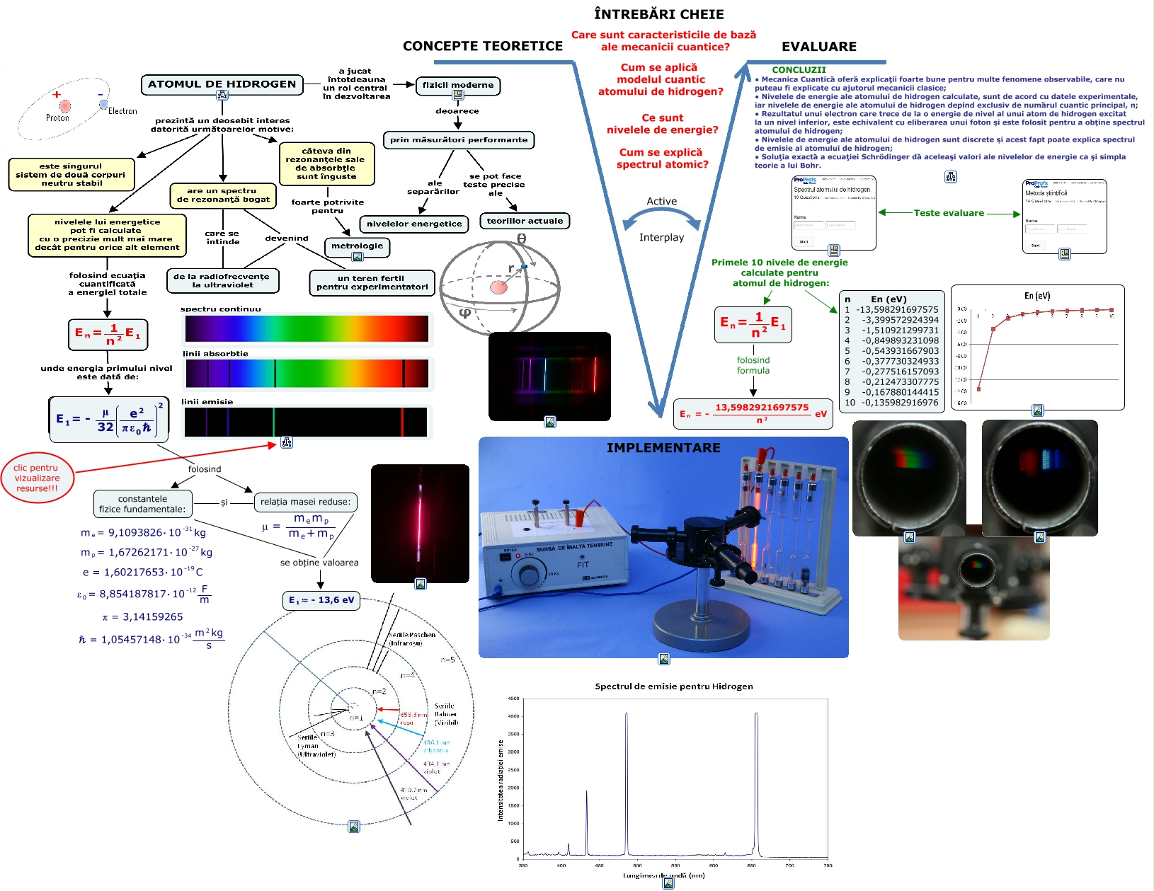 This Concept Map, created with IHMC CmapTools, has information related to: V_Spectrul Atomului de Hidrogen, constantele fizice fundamentale: și <math xmlns="http://www.w3.org/1998/Math/MathML"> <mtext> relația masei reduse: </mtext> </math>, CONCLUZII ∙ Mecanica Cuantică oferă explicaţii foarte bune pentru multe fenomene observabile, care nu puteau fi explicate cu ajutorul mecanicii clasice; ∙ Nivelele de energie ale atomului de hidrogen calculate, sunt de acord cu datele experimentale, iar nivelele de energie ale atomului de hidrogen depind exclusiv de numărul cuantic principal, n; ∙ Rezultatul unui electron care trece de la o energie de nivel al unui atom de hidrogen excitat la un nivel inferior, este echivalent cu eliberarea unui foton și este folosit pentru a obține spectrul atomului de hidrogen; ∙ Nivelele de energie ale atomului de hidrogen sunt discrete și acest fapt poate explica spectrul de emisie al atomului de hidrogen; ∙ Soluţia exactă a ecuaţiei Schrödinger dă aceleaşi valori ale nivelelor de energie ca şi simpla teorie a lui Bohr. Teste evaluare ????, <math xmlns="http://www.w3.org/1998/Math/MathML"> <mrow> <mmultiscripts> <mtext> E </mtext> <mtext> n </mtext> <none/> </mmultiscripts> <mtext> = </mtext> <mfrac> <mtext> 1 </mtext> <mmultiscripts> <mtext> n </mtext> <none/> <mtext> 2 </mtext> </mmultiscripts> </mfrac> <mmultiscripts> <mtext> E </mtext> <mtext> 1 </mtext> <none/> </mmultiscripts> </mrow> </math> Primele 10 nivele de energie calculate pentru atomul de hidrogen: n En (eV) 1 -13,598291697575 2 -3,399572924394 3 -1,510921299731 4 -0,849893231098 5 -0,543931667903 6 -0,377730324933 7 -0,277516157093 8 -0,212473307775 9 -0,167880144415 10 -0,135982916976, <math xmlns="http://www.w3.org/1998/Math/MathML"> <mrow> <mmultiscripts> <mtext> E </mtext> <mtext> n </mtext> <none/> </mmultiscripts> <mtext> = </mtext> <mfrac> <mtext> 1 </mtext> <mmultiscripts> <mtext> n </mtext> <none/> <mtext> 2 </mtext> </mmultiscripts> </mfrac> <mmultiscripts> <mtext> E </mtext> <mtext> 1 </mtext> <none/> </mmultiscripts> </mrow> </math> folosind formula <math xmlns="http://www.w3.org/1998/Math/MathML"> <mrow> <mmultiscripts> <mtext> E </mtext> <mtext> n </mtext> <none/> </mmultiscripts> <mtext> = - </mtext> <mfrac> <mtext> 13,5982921697575 </mtext> <mmultiscripts> <mtext> n </mtext> <none/> <mtext> 2 </mtext> </mmultiscripts> </mfrac> <mtext> eV </mtext> </mrow> </math>, constantele fizice fundamentale: se obține valoarea <math xmlns="http://www.w3.org/1998/Math/MathML"> <mrow> <mmultiscripts> <mtext> E </mtext> <mtext> 1 </mtext> <none/> </mmultiscripts> <mtext> ≈ - 13,6 eV </mtext> </mrow> </math>, <math xmlns="http://www.w3.org/1998/Math/MathML"> <mrow> <mmultiscripts> <mtext> E </mtext> <mtext> 1 </mtext> <none/> </mmultiscripts> <mtext> = - </mtext> <mrow> <mfrac> <mtext> μ </mtext> <mtext> 32 </mtext> </mfrac> <mmultiscripts> <mfenced open="(" close=")"> <mfrac> <mmultiscripts> <mtext> e </mtext> <none/> <mtext> 2 </mtext> </mmultiscripts> <mrow> <mtext> π </mtext> <mmultiscripts> <mtext> ε </mtext> <mtext> 0 </mtext> <none/> </mmultiscripts> <mtext> ℏ </mtext> </mrow> </mfrac> </mfenced> <none/> <mtext> 2 </mtext> </mmultiscripts> </mrow> </mrow> </math> folosind constantele fizice fundamentale:, <math xmlns="http://www.w3.org/1998/Math/MathML"> <mtext> relația masei reduse: </mtext> </math> se obține valoarea <math xmlns="http://www.w3.org/1998/Math/MathML"> <mrow> <mmultiscripts> <mtext> E </mtext> <mtext> 1 </mtext> <none/> </mmultiscripts> <mtext> ≈ - 13,6 eV </mtext> </mrow> </math>, <math xmlns="http://www.w3.org/1998/Math/MathML"> <mrow> <mmultiscripts> <mtext> E </mtext> <mtext> 1 </mtext> <none/> </mmultiscripts> <mtext> = - </mtext> <mrow> <mfrac> <mtext> μ </mtext> <mtext> 32 </mtext> </mfrac> <mmultiscripts> <mfenced open="(" close=")"> <mfrac> <mmultiscripts> <mtext> e </mtext> <none/> <mtext> 2 </mtext> </mmultiscripts> <mrow> <mtext> π </mtext> <mmultiscripts> <mtext> ε </mtext> <mtext> 0 </mtext> <none/> </mmultiscripts> <mtext> ℏ </mtext> </mrow> </mfrac> </mfenced> <none/> <mtext> 2 </mtext> </mmultiscripts> </mrow> </mrow> </math> folosind <math xmlns="http://www.w3.org/1998/Math/MathML"> <mtext> relația masei reduse: </mtext> </math>, clic pentru vizualizare resurse!!! ???? ????, CONCLUZII ∙ Mecanica Cuantică oferă explicaţii foarte bune pentru multe fenomene observabile, care nu puteau fi explicate cu ajutorul mecanicii clasice; ∙ Nivelele de energie ale atomului de hidrogen calculate, sunt de acord cu datele experimentale, iar nivelele de energie ale atomului de hidrogen depind exclusiv de numărul cuantic principal, n; ∙ Rezultatul unui electron care trece de la o energie de nivel al unui atom de hidrogen excitat la un nivel inferior, este echivalent cu eliberarea unui foton și este folosit pentru a obține spectrul atomului de hidrogen; ∙ Nivelele de energie ale atomului de hidrogen sunt discrete și acest fapt poate explica spectrul de emisie al atomului de hidrogen; ∙ Soluţia exactă a ecuaţiei Schrödinger dă aceleaşi valori ale nivelelor de energie ca şi simpla teorie a lui Bohr. Teste evaluare ????