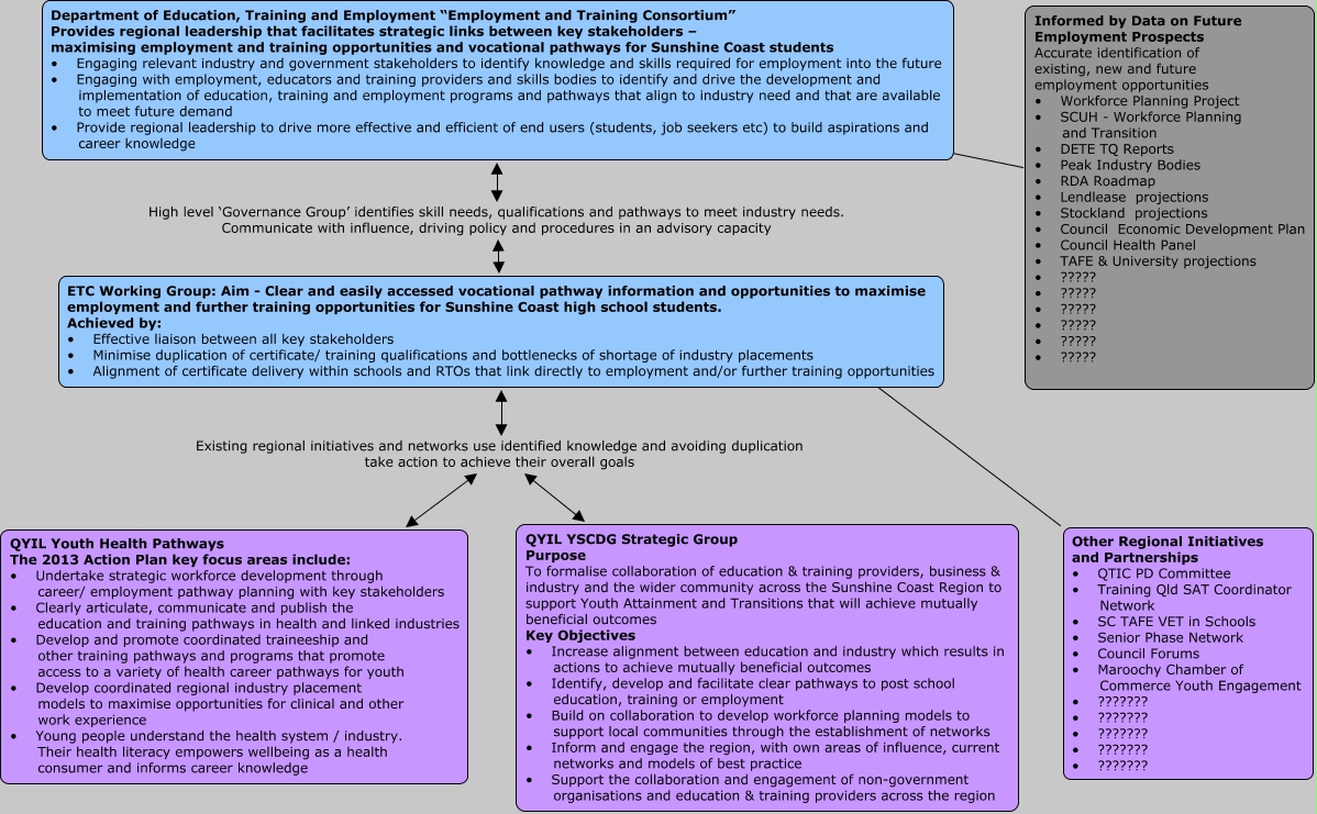 This Concept Map, created with IHMC CmapTools, has information related to: YSCDG Regional Fit, ETC Working Group: Aim - Clear and easily accessed vocational pathway information and opportunities to maximise employment and further training opportunities for Sunshine Coast high school students. Achieved by: • Effective liaison between all key stakeholders • Minimise duplication of certificate/ training qualifications and bottlenecks of shortage of industry placements • Alignment of certificate delivery within schools and RTOs that link directly to employment and/or further training opportunities Existing regional initiatives and networks use identified knowledge and avoiding duplication take action to achieve their overall goals QYIL Youth Health Pathways The 2013 Action Plan key focus areas include: • Undertake strategic workforce development through career/ employment pathway planning with key stakeholders • Clearly articulate, communicate and publish the education and training pathways in health and linked industries • Develop and promote coordinated traineeship and other training pathways and programs that promote access to a variety of health career pathways for youth • Develop coordinated regional industry placement models to maximise opportunities for clinical and other work experience • Young people understand the health system / industry. Their health literacy empowers wellbeing as a health consumer and informs career knowledge, ETC Working Group: Aim - Clear and easily accessed vocational pathway information and opportunities to maximise employment and further training opportunities for Sunshine Coast high school students. Achieved by: • Effective liaison between all key stakeholders • Minimise duplication of certificate/ training qualifications and bottlenecks of shortage of industry placements • Alignment of certificate delivery within schools and RTOs that link directly to employment and/or further training opportunities Existing regional initiatives and networks use identified knowledge and avoiding duplication take action to achieve their overall goals QYIL YSCDG Strategic Group Purpose To formalise collaboration of education & training providers, business & industry and the wider community across the Sunshine Coast Region to support Youth Attainment and Transitions that will achieve mutually beneficial outcomes Key Objectives • Increase alignment between education and industry which results in actions to achieve mutually beneficial outcomes • Identify, develop and facilitate clear pathways to post school education, training or employment • Build on collaboration to develop workforce planning models to support local communities through the establishment of networks • Inform and engage the region, with own areas of influence, current networks and models of best practice • Support the collaboration and engagement of non-government organisations and education & training providers across the region, ETC Working Group: Aim - Clear and easily accessed vocational pathway information and opportunities to maximise employment and further training opportunities for Sunshine Coast high school students. Achieved by: • Effective liaison between all key stakeholders • Minimise duplication of certificate/ training qualifications and bottlenecks of shortage of industry placements • Alignment of certificate delivery within schools and RTOs that link directly to employment and/or further training opportunities ???? Other Regional Initiatives and Partnerships • QTIC PD Committee • Training Qld SAT Coordinator Network • SC TAFE VET in Schools • Senior Phase Network • Council Forums • Maroochy Chamber of Commerce Youth Engagement • ??????? • ??????? • ??????? • ??????? • ???????, Department of Education, Training and Employment “Employment and Training Consortium” Provides regional leadership that facilitates strategic links between key stakeholders – maximising employment and training opportunities and vocational pathways for Sunshine Coast students • Engaging relevant industry and government stakeholders to identify knowledge and skills required for employment into the future • Engaging with employment, educators and training providers and skills bodies to identify and drive the development and implementation of education, training and employment programs and pathways that align to industry need and that are available to meet future demand • Provide regional leadership to drive more effective and efficient of end users (students, job seekers etc) to build aspirations and career knowledge ???? Informed by Data on Future Employment Prospects Accurate identification of existing, new and future employment opportunities • Workforce Planning Project • SCUH - Workforce Planning and Transition • DETE TQ Reports • Peak Industry Bodies • RDA Roadmap • Lendlease projections • Stockland projections • Council Economic Development Plan • Council Health Panel • TAFE & University projections • ????? • ????? • ????? • ????? • ????? • ?????, Department of Education, Training and Employment “Employment and Training Consortium” Provides regional leadership that facilitates strategic links between key stakeholders – maximising employment and training opportunities and vocational pathways for Sunshine Coast students • Engaging relevant industry and government stakeholders to identify knowledge and skills required for employment into the future • Engaging with employment, educators and training providers and skills bodies to identify and drive the development and implementation of education, training and employment programs and pathways that align to industry need and that are available to meet future demand • Provide regional leadership to drive more effective and efficient of end users (students, job seekers etc) to build aspirations and career knowledge High level ‘Governance Group’ identifies sk
