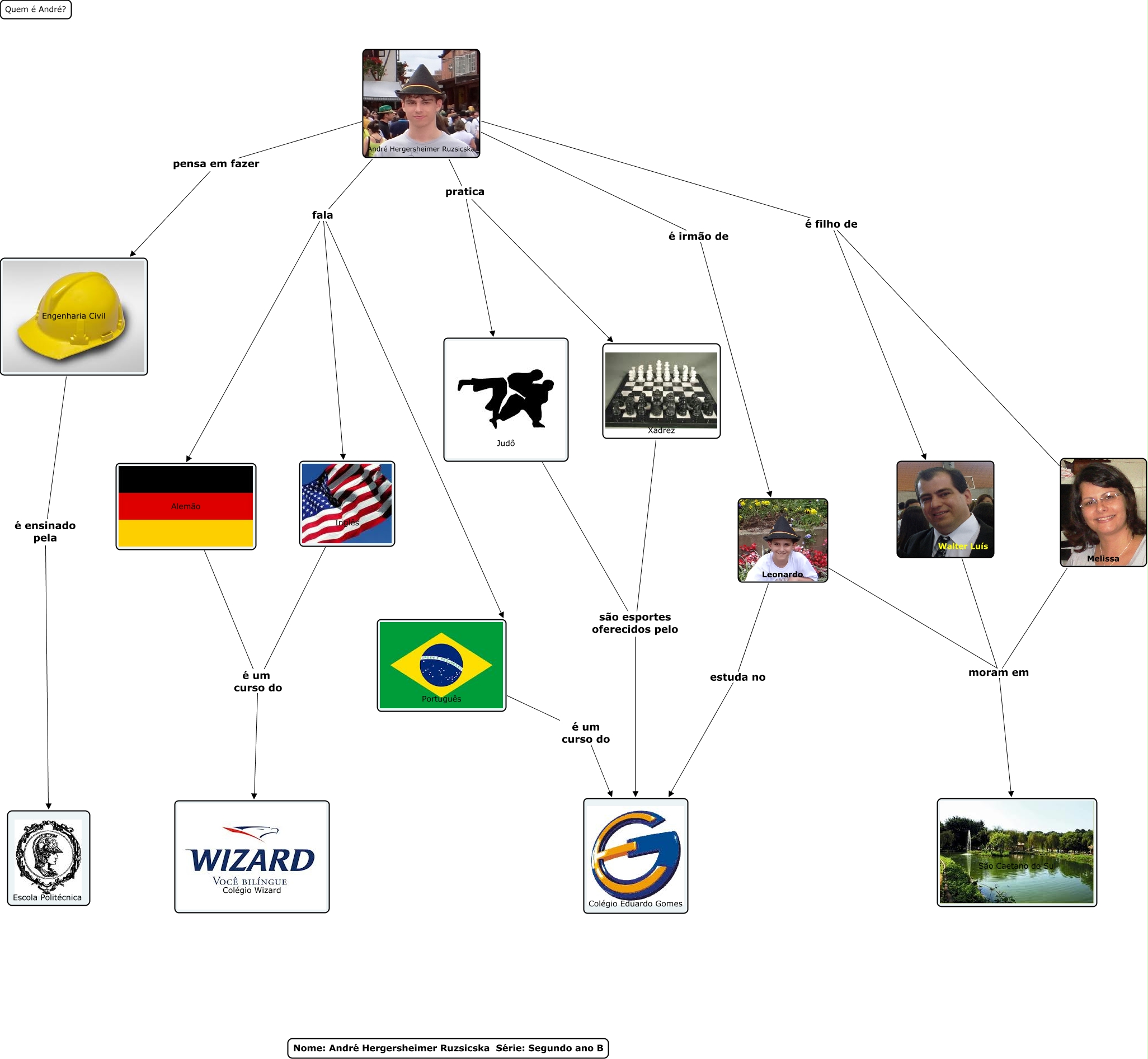 Esse mapa conceitual, produzido no IHMC CmapTools, tem a informação relacionada a: André, Walter Luís moram em São Caetano do Sul, Leonardo moram em São Caetano do Sul, Leonardo estuda no Colégio Eduardo Gomes, André Hergersheimer Ruzsicska é filho de Melissa, André Hergersheimer Ruzsicska fala Português, André Hergersheimer Ruzsicska fala Alemão, Judô são esportes oferecidos pelo Colégio Eduardo Gomes, André Hergersheimer Ruzsicska pratica Judô, André Hergersheimer Ruzsicska fala Inglês, André Hergersheimer Ruzsicska pensa em fazer Engenharia Civil, André Hergersheimer Ruzsicska é filho de Walter Luís, Melissa moram em São Caetano do Sul, Engenharia Civil é ensinado pela Escola Politécnica, Português é um curso do Colégio Eduardo Gomes, André Hergersheimer Ruzsicska pratica Xadrez, Xadrez são esportes oferecidos pelo Colégio Eduardo Gomes, André Hergersheimer Ruzsicska é irmão de Leonardo, Alemão é um curso do Colégio Wizard, Inglês é um curso do Colégio Wizard