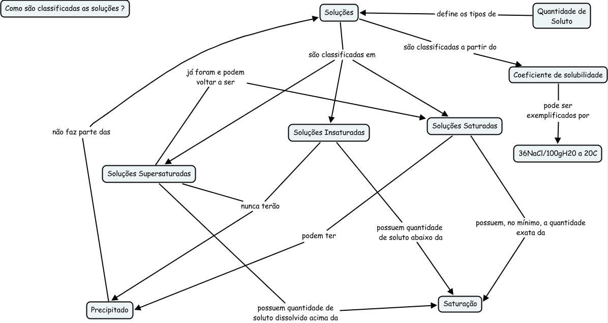 Esse mapa conceitual, produzido no IHMC CmapTools, tem a informação relacionada a: Saturação 2A 2013, Soluções Supersaturadas possuem quantidade de soluto dissolvido acima da Saturação, Soluções Supersaturadas já foram e podem voltar a ser Soluções Saturadas, Soluções são classificadas em Soluções Supersaturadas, Soluções Supersaturadas nunca terão Precipitado, Quantidade de Soluto define os tipos de Soluções, Soluções Saturadas possuem, no mínimo, a quantidade exata da Saturação, Precipitado não faz parte das Soluções, Soluções Insaturadas possuem quantidade de soluto abaixo da Saturação, Soluções são classificadas em Soluções Saturadas, Soluções são classificadas em Soluções Insaturadas, Soluções Saturadas podem ter Precipitado, Coeficiente de solubilidade pode ser exemplificados por 36NaCl/100gH20 a 20C, Soluções Insaturadas nunca terão Precipitado, Soluções são classificadas a partir do Coeficiente de solubilidade