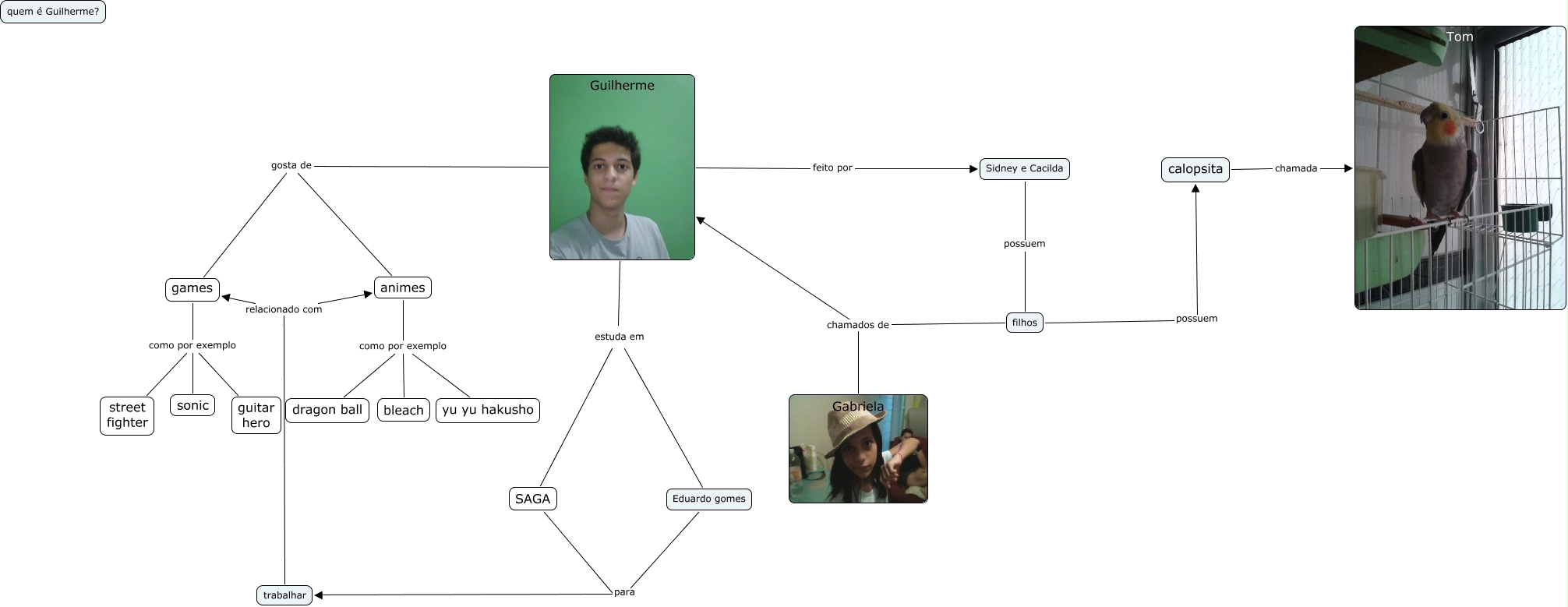 Esse mapa conceitual, produzido no IHMC CmapTools, tem a informação relacionada a: Guilherme Viana, Guilherme gosta de games, Guilherme gosta de animes, animes como por exemplo bleach, games como por exemplo guitar hero, filhos chamados de Guilherme, Guilherme estuda em SAGA, animes como por exemplo dragon ball, trabalhar relacionado com games, games como por exemplo sonic, animes como por exemplo yu yu hakusho, Guilherme feito por Sidney e Cacilda, trabalhar relacionado com animes, filhos possuem calopsita, games como por exemplo street fighter, Eduardo gomes para trabalhar, Sidney e Cacilda possuem filhos, Guilherme estuda em Eduardo gomes, filhos chamados de Gabriela, calopsita chamada Tom, SAGA para trabalhar