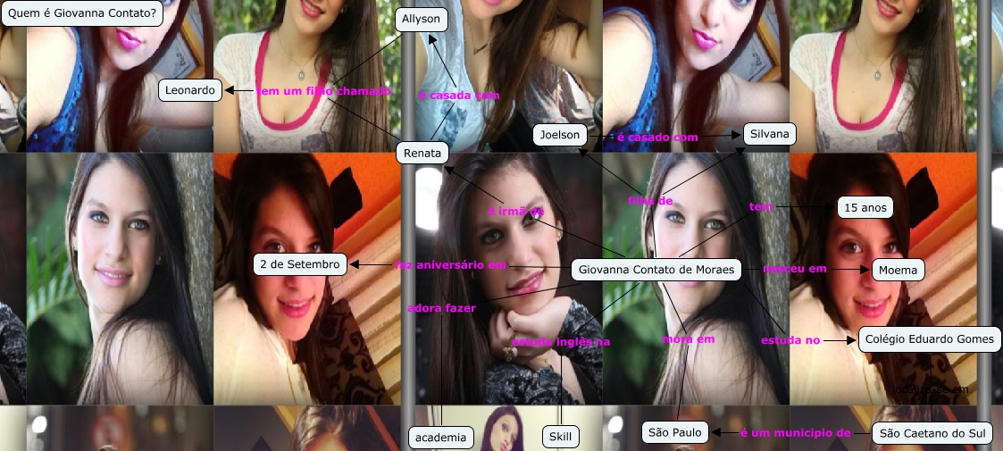 Esse mapa conceitual, produzido no IHMC CmapTools, tem a informação relacionada a: Giovanna Contato, Giovanna Contato de Moraes filha de Silvana, Giovanna Contato de Moraes tem 15 anos, Renata tem um filho chamado Leonardo, Allyson tem um filho chamado Leonardo, Giovanna Contato de Moraes faz aniversário em 2 de Setembro, Giovanna Contato de Moraes é irmã de Renata, Giovanna Contato de Moraes adora fazer academia, Giovanna Contato de Moraes estuda no Colégio Eduardo Gomes, Giovanna Contato de Moraes filha de Joelson, Giovanna Contato de Moraes mora em São Paulo, São Caetano do Sul é um municipio de São Paulo, Giovanna Contato de Moraes nasceu em Moema, Colégio Eduardo Gomes localiza-se em São Caetano do Sul, Renata é casada com Allyson, Giovanna Contato de Moraes estuda inglês na Skill, Joelson é casado com Silvana