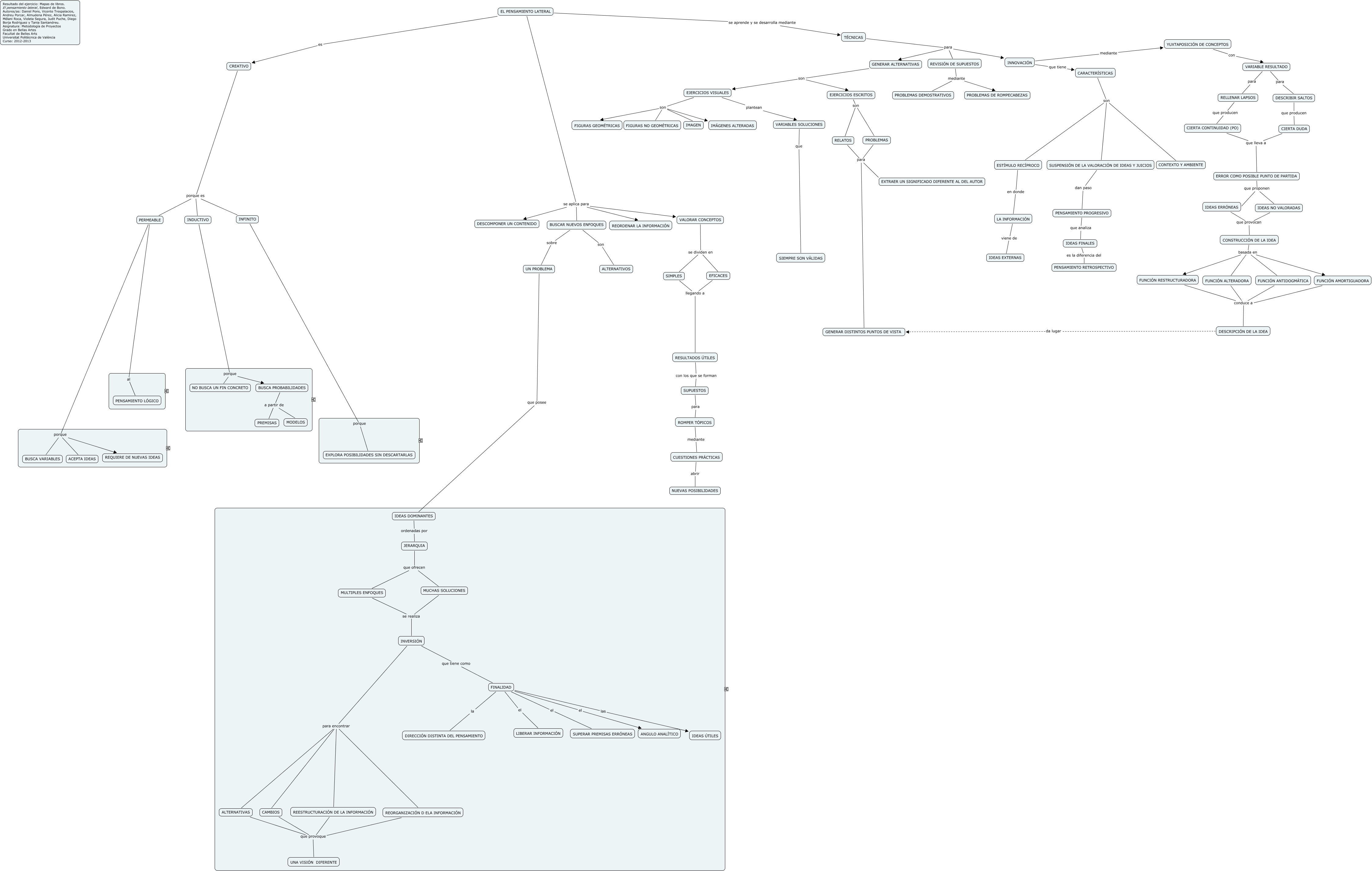 Este Cmap, tiene información relacionada con: DE BONO, FINALIDAD el SUPERAR PREMISAS ERRÓNEAS, YUXTAPOSICIÓN DE CONCEPTOS con VARIABLE RESULTADO, EL PENSAMIENTO LATERAL se aprende y se desarrolla mediante TÉCNICAS, BUSCAR NUEVOS ENFOQUES sobre UN PROBLEMA, EFICACES llegando a RESULTADOS ÚTILES, INNOVACIÓN mediante YUXTAPOSICIÓN DE CONCEPTOS, VARIABLE RESULTADO para DESCRIBIR SALTOS, PROBLEMAS para EXTRAER UN SIGNIFICADO DIFERENTE AL DEL AUTOR, REESTRUCTURACIÓN DE LA INFORMACIÓN que provoque UNA VISIÓN DIFERENTE, INVERSIÓN para encontrar ALTERNATIVAS, VARIABLE RESULTADO para RELLENAR LAPSOS, EL PENSAMIENTO LATERAL se aplica para REORDENAR LA INFORMACIÓN, DESCRIBIR SALTOS que producen CIERTA DUDA, EL PENSAMIENTO LATERAL es CREATIVO, EJERCICIOS VISUALES son FIGURAS NO GEOMÉTRICAS, IDEAS DOMINANTES ordenadas por JERARQUIA, CARACTERÍSTICAS son ESTÍMULO RECÍPROCO, FUNCIÓN ANTIDOGMÁTICA conduce a DESCRIPCIÓN DE LA IDEA, GENERAR ALTERNATIVAS son EJERCICIOS ESCRITOS, ROMPER TÓPICOS mediante CUESTIONES PRÁCTICAS