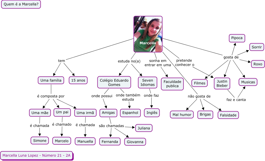 Esse mapa conceitual, produzido no IHMC CmapTools, tem a informação relacionada a: Marcella Luna Lopez Nº21, Uma família é composta por Uma irmã, Uma irmã é chamada Manuella, Marcella gosta de Sorrir, Um pai é chamado Marcelo, Marcella estuda no(a) Colégio Eduardo Gomes, Marcella não gosta de Brigas, Marcella pretende conhecer o Justin Bieber, Marcella gosta de Filmes, Marcella não gosta de Falsidade, Marcella não gosta de Mal humor, Uma mãe é chamada Simone, Marcella gosta de Musicas, Amigas são chamadas Juliana, Colégio Eduardo Gomes onde também estuda Espanhol, Amigas são chamadas Giovanna, Seven Idiomas onde faz Inglês, Amigas são chamadas Fernanda, Uma família é composta por Um pai, Marcella gosta de Roxo, Marcella tem Uma família