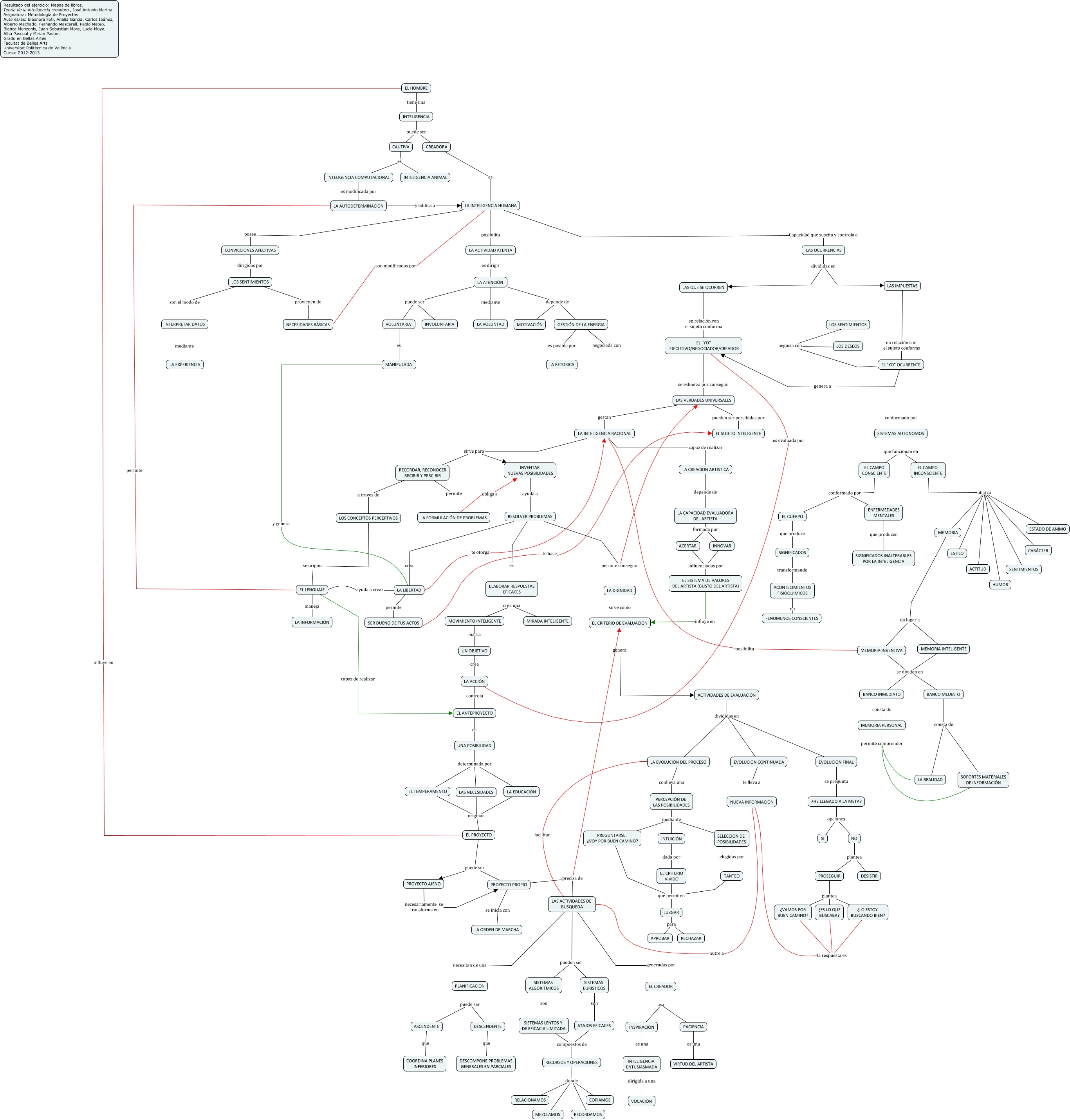Este Cmap, tiene información relacionada con: Teoría de la Inteligencia creadora. J. A. Marina, EL CRITERIO DE EVALUACIÓN genera ACTIVIDADES DE EVALUACIÓN, INVENTAR NUEVAS POSIBILIDADES ayuda a RESOLVER PROBLEMAS, JUZGAR para RECHAZAR, PROYECTO PROPIO precisa de LAS ACTIVIDADES DE BUSQUEDA, ¿LO ESTOY BUSCANDO BIEN? la respuesta es NUEVA INFORMACIÓN, ACERTAR influenciadas por EL SISTEMA DE VALORES DEL ARTISTA (GUSTO DEL ARTISTA), ELABORAR RESPUESTAS EFICACES crea una MIRADA INTELIGENTE, EL LENGUAJE ayuda a crear LA LIBERTAD, CAUTIVA es INTELIGENCIA ANIMAL, ACTIVIDADES DE EVALUACIÓN divididas en LA EVOLUCIÓN DEL PROCESO, JUZGAR para APROBAR, PROSEGUIR plantea ¿LO ESTOY BUSCANDO BIEN?, MEMORIA INTELIGENTE se dividen en BANCO INMEDIATO, LA FORMULACIÓN DE PROBLEMAS obliga a INVENTAR NUEVAS POSIBILIDADES, PREGUNTARSE: ¿VOY POR BUEN CAMINO? que permiten JUZGAR, NECESIDADES BÁSICAS son modificadas por LA INTELIGENCIA HUMANA, PERCEPCIÓN DE LAS POSIBILIDADES mediante PREGUNTARSE: ¿VOY POR BUEN CAMINO?, EL "YO" OCURRENTE conformado por SISTEMAS AUTONOMOS, LAS IMPUESTAS en relación con el sujeto conforma EL "YO" OCURRENTE, LA INTELIGENCIA RACIONAL capaz de realizar LA CREACION ARTISTICA