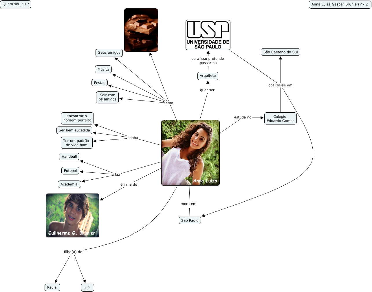 Esse mapa conceitual, produzido no IHMC CmapTools, tem a informação relacionada a: Anna Luiza Gaspar Brunieri nº2, Guilherme G. Brunieri filho(a) de Luís, Anna Luiza sonha Ser bem sucedida, Guilherme G. Brunieri filho(a) de Paula, Anna Luiza filho(a) de Luís, Anna Luiza estuda no Colégio Eduardo Gomes, localiza-se em São Caetano do Sul, Anna Luiza faz Futebol, Arquiteta para isso pretende passar na, Anna Luiza é irmã de Guilherme G. Brunieri, Anna Luiza ama Música, Anna Luiza ama Sair com os amigos, Anna Luiza faz Handball, Anna Luiza ama Seus amigos, Anna Luiza sonha Ter um padrão de vida bom, Anna Luiza quer ser Arquiteta, Anna Luiza sonha Encontrar o homem perfeito, Colégio Eduardo Gomes localiza-se em São Caetano do Sul, Anna Luiza filho(a) de Paula, Colégio Eduardo Gomes localiza-se em São Paulo, Anna Luiza mora em São Paulo