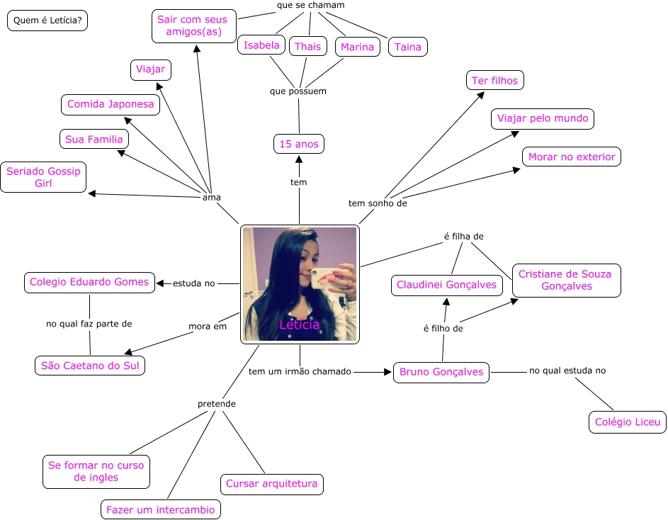 Esse mapa conceitual, produzido no IHMC CmapTools, tem a informação relacionada a: Leticia Goncalves 2C, Letícia tem um irmão chamado Bruno Gonçalves, Letícia é filha de Cristiane de Souza Gonçalves, Letícia pretende Fazer um intercambio, Letícia tem sonho de Ter filhos, Letícia tem 15 anos, Letícia ama Viajar, Letícia tem sonho de Morar no exterior, Letícia tem sonho de Viajar pelo mundo, Letícia mora em São Caetano do Sul, Letícia pretende Se formar no curso de ingles, Bruno Gonçalves é filho de Cristiane de Souza Gonçalves, Thais que possuem 15 anos, Sair com seus amigos(as) que se chamam Marina, Letícia ama Seriado Gossip Girl, Sair com seus amigos(as) que se chamam Taina, Bruno Gonçalves no qual estuda no Colégio Liceu, Marina que possuem 15 anos, Letícia é filha de Claudinei Gonçalves, Letícia pretende Cursar arquitetura, Sair com seus amigos(as) que se chamam Isabela