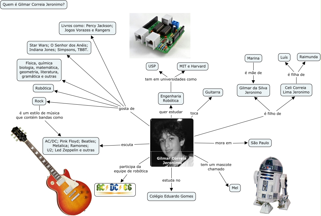 This Concept Map, created with IHMC CmapTools, has information related to: Gilmar Correia Jeronimo - Nº11, Gilmar Correia Jeronimo estuda no Colégio Eduardo Gomes, Gilmar Correia Jeronimo quer estudar Engenharia Robótica, Engenharia Robótica tem em universidades como USP, Celi Correia Lima Jeronimo é filha de Luís, Engenharia Robótica tem em universidades como MIT e Harvard, Gilmar Correia Jeronimo é filho de Celi Correia Lima Jeronimo, Gilmar Correia Jeronimo gosta de Rock, Gilmar Correia Jeronimo toca Guitarra, Gilmar Correia Jeronimo gosta de Física, química biologia, matemática, geometria, literatura, gramática e outras, Marina é mãe de Gilmar da Silva Jeronimo, Rock é um estilo de música que contém bandas como AC/DC; Pink Floyd; Beatles; Metalica; Ramones; U2; Led Zeppelin e outras, Gilmar Correia Jeronimo gosta de Robótica, Gilmar Correia Jeronimo gosta de Livros como: Percy Jackson; Jogos Vorazes e Rangers, Gilmar Correia Jeronimo tem um mascote chamado Mel, Gilmar Correia Jeronimo escuta AC/DC; Pink Floyd; Beatles; Metalica; Ramones; U2; Led Zeppelin e outras, Celi Correia Lima Jeronimo é filha de Raimunda, Gilmar Correia Jeronimo é filho de Gilmar da Silva Jeronimo, Gilmar Correia Jeronimo gosta de Star Wars; O Senhor dos Anéis; Indiana Jones; Simpsons, TBBT., Gilmar Correia Jeronimo mora em São Paulo, Gilmar Correia Jeronimo participa da equipe de robótica