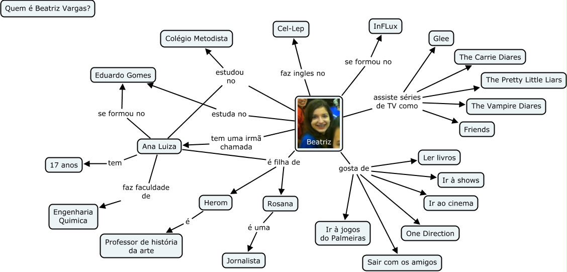 Esse mapa conceitual, produzido no IHMC CmapTools, tem a informação relacionada a: Beatriz, Beatriz gosta de Ir ao cinema, Ana Luiza é filha de Herom, Beatriz gosta de Ir à jogos do Palmeiras, Beatriz assiste séries de TV como The Pretty Little Liars, Beatriz gosta de Ler livros, Beatriz tem uma irmã chamada Ana Luiza, Beatriz faz ingles no Cel-Lep, Ana Luiza faz faculdade de Engenharia Quimica, Beatriz assiste séries de TV como Friends, Beatriz é filha de Herom, Ana Luiza estudou no Colégio Metodista, Rosana é uma Jornalista, Ana Luiza é filha de Rosana, Ana Luiza tem 17 anos, Beatriz estuda no Eduardo Gomes, Beatriz se formou no InFLux, Ana Luiza se formou no Eduardo Gomes, Beatriz assiste séries de TV como The Carrie Diares, Beatriz gosta de One Direction, Beatriz estudou no Colégio Metodista