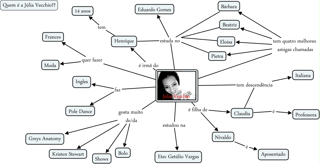 Esse mapa conceitual, produzido no IHMC CmapTools, tem a informação relacionada a: Quem é Julia Vecchio, Júlia Vecchio tem descendência Italiana, Júlia Vecchio quer fazer Moda, Júlia Vecchio gosta muito de/da Kristen Stewart, Pietra estuda no Eduardo Gomes, Júlia Vecchio faz Pole Dance, Júlia Vecchio gosta muito de/da Greys Anatomy, Júlia Vecchio é irmã do Henrique, Henrique estuda no Eduardo Gomes, Júlia Vecchio é filha de Claudia, Júlia Vecchio tem quatro melhores amigas chamadas Bárbara, Nivaldo é Aposentado, Júlia Vecchio é filha de Nivaldo, Beatriz estuda no Eduardo Gomes, Júlia Vecchio tem quatro melhores amigas chamadas Beatriz, Júlia Vecchio gosta muito de/da Bolo, Júlia Vecchio estudou na Etec Getúlio Vargas, Júlia Vecchio quer fazer Frances, Claudia tem descendência Italiana, Júlia Vecchio tem quatro melhores amigas chamadas Pietra, Bárbara estuda no Eduardo Gomes