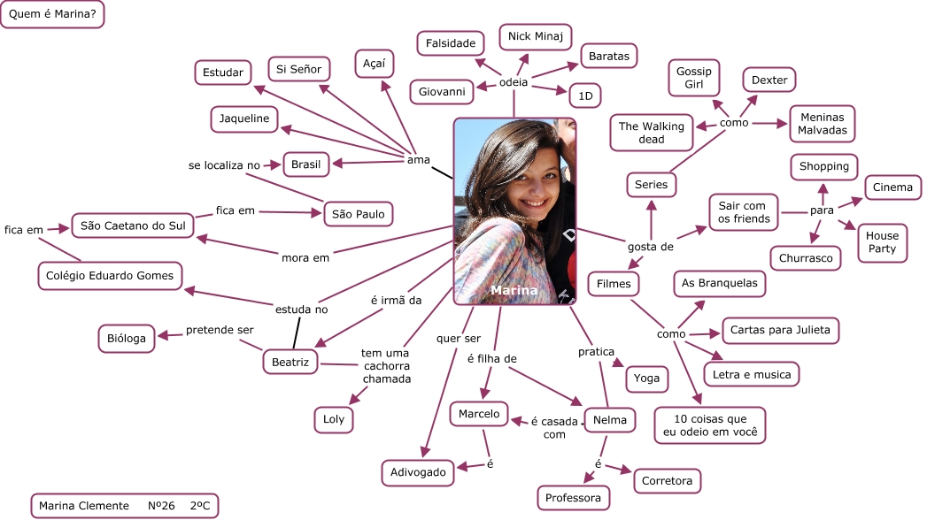Esse mapa conceitual, produzido no IHMC CmapTools, tem a informação relacionada a: Marina Clemente Nº26, Marina gosta de Filmes, Sair com os friends para Churrasco, Marina odeia Nick Minaj, Marina ama Açaí, Series como The Walking dead, Marina ama Brasil, Sair com os friends para Shopping, Marina quer ser Adivogado, Marina é filha de Nelma, Filmes como Cartas para Julieta, Marina ama Jaqueline, Marina tem uma cachorra chamada Loly, Beatriz tem uma cachorra chamada Loly, Marina gosta de Series, Filmes como As Branquelas, Nelma pratica Yoga, Nelma é Corretora, Sair com os friends para Cinema, Colégio Eduardo Gomes fica em São Caetano do Sul, São Paulo se localiza no Brasil