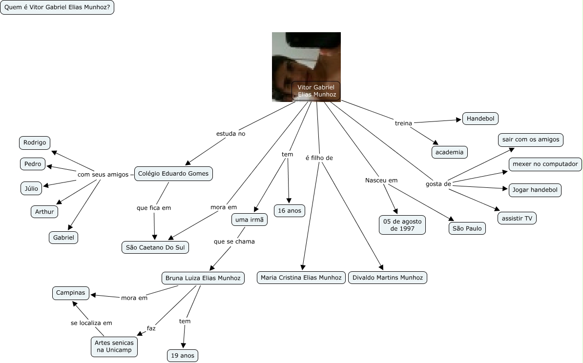 Esse mapa conceitual, produzido no IHMC CmapTools, tem a informação relacionada a: Vitor Munhoz n°35, Vitor Gabriel Elias Munhoz Nasceu em São Paulo, Colégio Eduardo Gomes com seus amigos Júlio, Bruna Luiza Elias Munhoz faz Artes senicas na Unicamp, Vitor Gabriel Elias Munhoz gosta de assistir TV, Vitor Gabriel Elias Munhoz tem uma irmã, Colégio Eduardo Gomes com seus amigos Rodrigo, Vitor Gabriel Elias Munhoz gosta de Jogar handebol, Vitor Gabriel Elias Munhoz é filho de Divaldo Martins Munhoz, Artes senicas na Unicamp se localiza em Campinas, uma irmã que se chama Bruna Luiza Elias Munhoz, Colégio Eduardo Gomes com seus amigos Gabriel, Vitor Gabriel Elias Munhoz estuda no Colégio Eduardo Gomes, Bruna Luiza Elias Munhoz tem 19 anos, Vitor Gabriel Elias Munhoz Nasceu em 05 de agosto de 1997, Vitor Gabriel Elias Munhoz tem 16 anos, Vitor Gabriel Elias Munhoz treina Handebol, Vitor Gabriel Elias Munhoz gosta de sair com os amigos, Vitor Gabriel Elias Munhoz mora em São Caetano Do Sul, Colégio Eduardo Gomes com seus amigos Arthur, Bruna Luiza Elias Munhoz mora em Campinas
