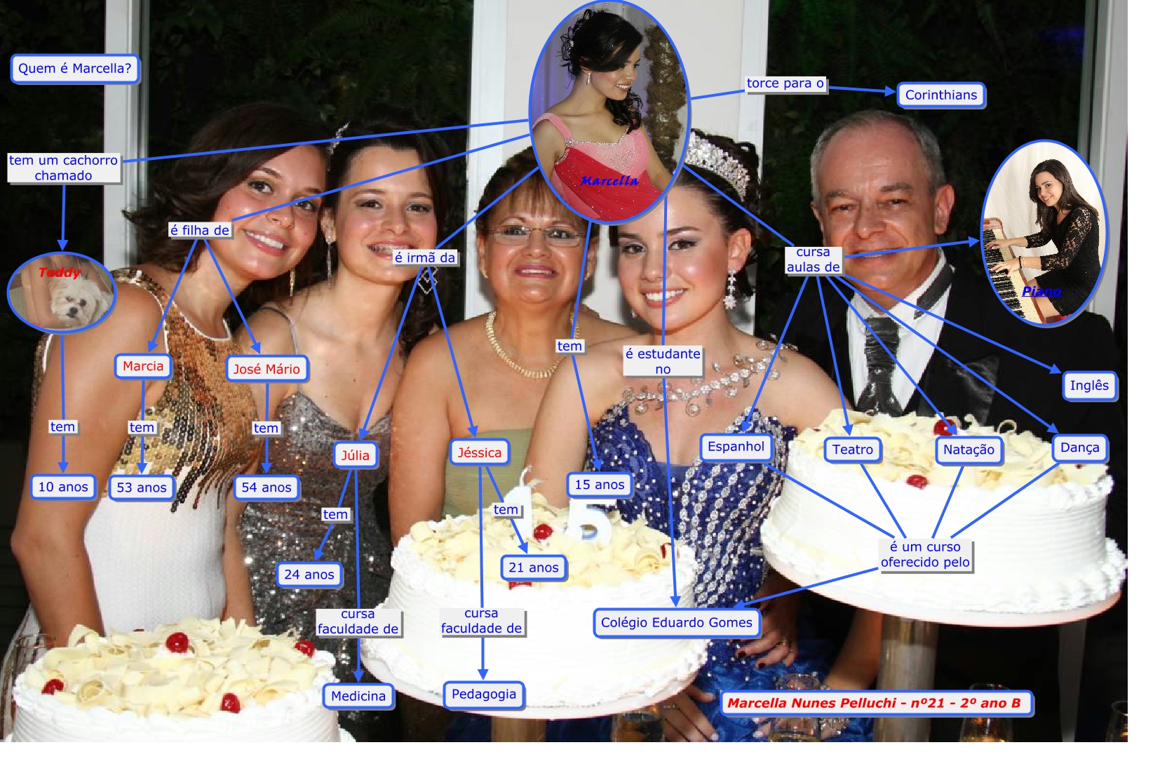 Esse mapa conceitual, produzido no IHMC CmapTools, tem a informação relacionada a: Mapa conceitual - Marcella, Dança é um curso oferecido pelo Colégio Eduardo Gomes, Natação é um curso oferecido pelo Colégio Eduardo Gomes, Espanhol é um curso oferecido pelo Colégio Eduardo Gomes, Marcella é filha de Marcia, Marcella é irmã da Júlia, Marcella é estudante no Colégio Eduardo Gomes, Júlia cursa faculdade de Medicina, Teatro é um curso oferecido pelo Colégio Eduardo Gomes, Marcella cursa aulas de Espanhol, Marcella torce para o Corinthians, Marcia tem 53 anos, Marcella é irmã da Jéssica, Marcella tem 15 anos, Marcella cursa aulas de Natação, Júlia tem 24 anos, Teddy tem 10 anos, Jéssica tem 21 anos, José Mário tem 54 anos, Marcella cursa aulas de Piano, Jéssica cursa faculdade de Pedagogia
