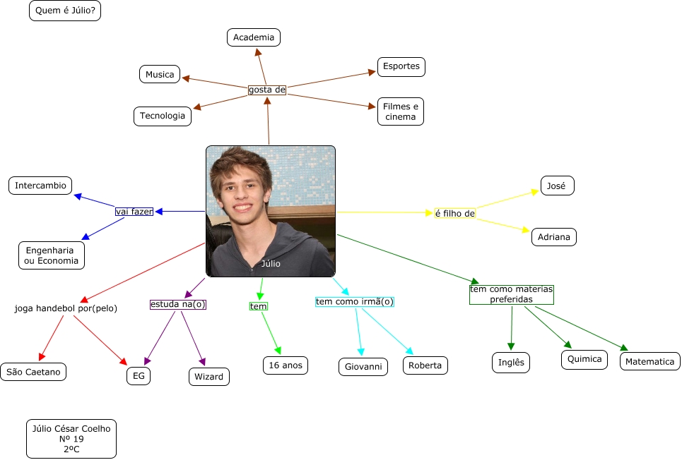 Esse mapa conceitual, produzido no IHMC CmapTools, tem a informação relacionada a: Julio Coelho nº19, Júlio tem como materias preferidas Inglês, Júlio joga handebol por(pelo) São Caetano, Júlio estuda na(o) Wizard, Júlio vai fazer Intercambio, Júlio tem como materias preferidas Quimica, Júlio gosta de Musica, Júlio gosta de Tecnologia, Júlio é filho de Adriana, Júlio gosta de Esportes, Júlio vai fazer Engenharia ou Economia, Júlio gosta de Academia, Júlio tem como irmã(o) Roberta, Júlio joga handebol por(pelo) EG, Júlio tem como irmã(o) Giovanni, Júlio tem 16 anos, Júlio estuda na(o) EG, Júlio gosta de Filmes e cinema, Júlio é filho de José, Júlio tem como materias preferidas Matematica