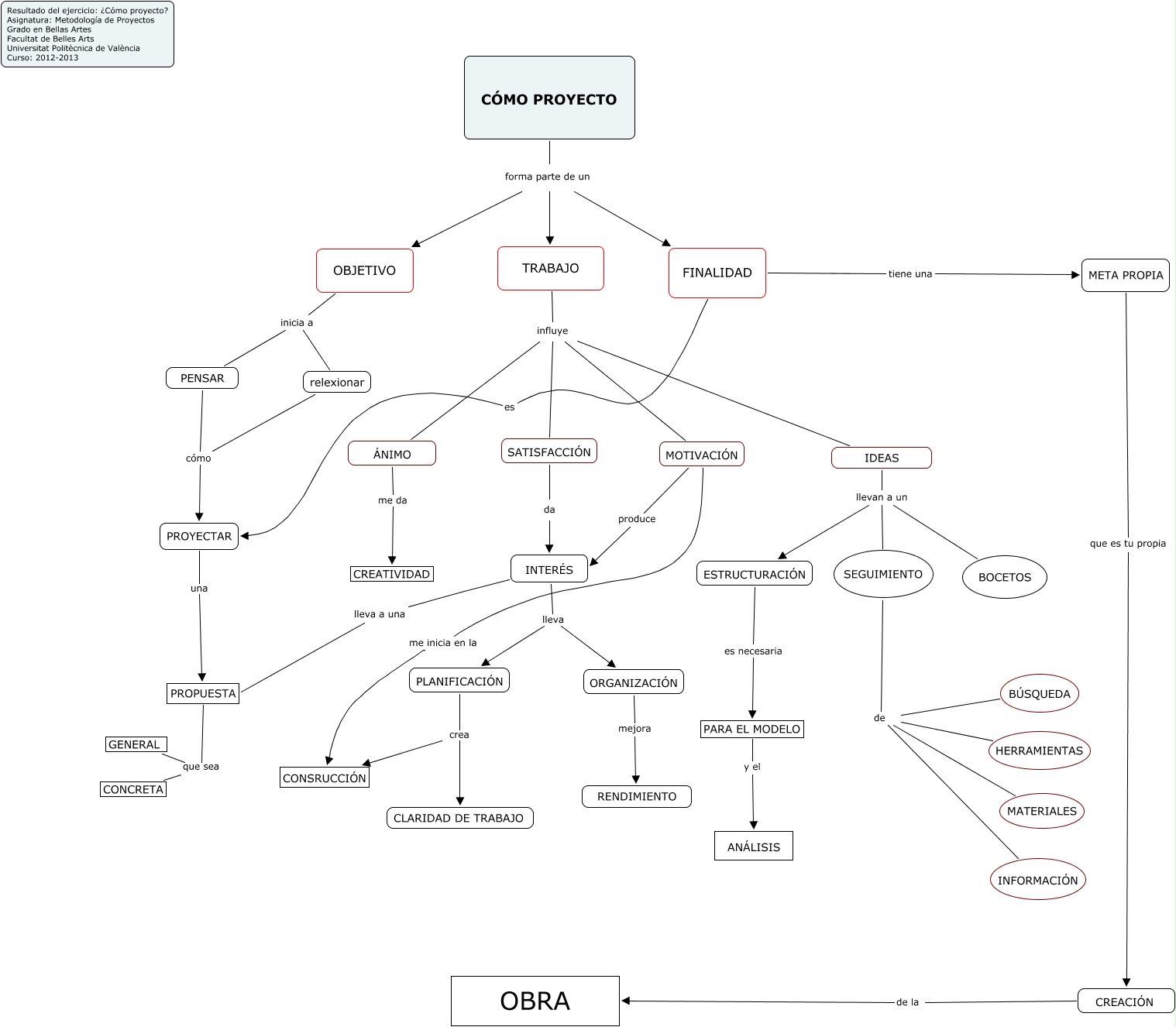 Este Cmap, tiene información relacionada con: Domingo Moreno, Marisa, FINALIDAD tiene una META PROPIA, SATISFACCIÓN da INTERÉS, OBJETIVO inicia a relexionar, IDEAS llevan a un BOCETOS, TRABAJO influye ÁNIMO, TRABAJO influye SATISFACCIÓN, PENSAR cómo PROYECTAR, CREACIÓN de la OBRA, SEGUIMIENTO de INFORMACIÓN, SEGUIMIENTO de BÚSQUEDA, SEGUIMIENTO de HERRAMIENTAS, PLANIFICACIÓN crea CONSRUCCIÓN, INTERÉS lleva ORGANIZACIÓN, ÁNIMO me da CREATIVIDAD, META PROPIA que es tu propia CREACIÓN, PLANIFICACIÓN crea CLARIDAD DE TRABAJO, INTERÉS lleva a una PROPUESTA, CÓMO PROYECTO forma parte de un FINALIDAD, MOTIVACIÓN produce INTERÉS, ESTRUCTURACIÓN es necesaria PARA EL MODELO