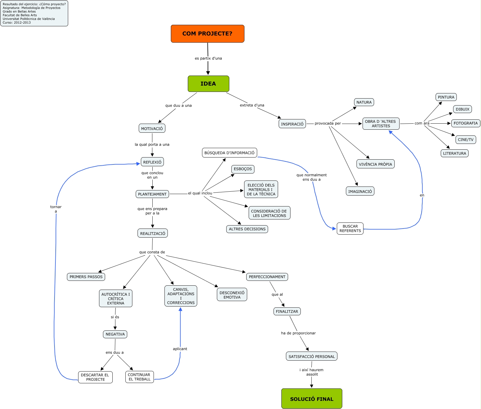 Este Cmap, tiene información relacionada con: Com Projecte. Empar Banyuls, REALITZACIÓ que consta de PERFECCIONAMENT, COM PROJECTE? es partix d'una IDEA, OBRA D 'ALTRES ARTISTES com ara CINE/TV, REFLEXIÓ que conclou en un PLANTEJAMENT, AUTOCRÍTICA I CRÍTICA EXTERNA si és NEGATIVA, OBRA D 'ALTRES ARTISTES com ara PINTURA, NEGATIVA ens duu a DESCARTAR EL PROJECTE, PLANTEJAMENT el qual inclou CONSIDERACIÓ DE LES LIMITACIONS, PLANTEJAMENT el qual inclou BÚSQUEDA D'INFORMACIÓ, SATISFACCIÓ PERSONAL i així haurem assolit SOLUCIÓ FINAL, CONTINUAR EL TREBALL aplicant CANVIS, ADAPTACIONS I CORRECCIONS, OBRA D 'ALTRES ARTISTES com ara LITERATURA, PLANTEJAMENT el qual inclou ESBOÇOS, REALITZACIÓ que consta de PRIMERS PASSOS, REALITZACIÓ que consta de AUTOCRÍTICA I CRÍTICA EXTERNA, BÚSQUEDA D'INFORMACIÓ que normalment ens duu a BUSCAR REFERENTS, FINALITZAR ha de proporcionar SATISFACCIÓ PERSONAL, INSPIRACIÓ provocada per IMAGINACIÓ, PLANTEJAMENT el qual inclou ELECCIÓ DELS MATERIALS I DE LA TÈCNICA, INSPIRACIÓ provocada per OBRA D 'ALTRES ARTISTES