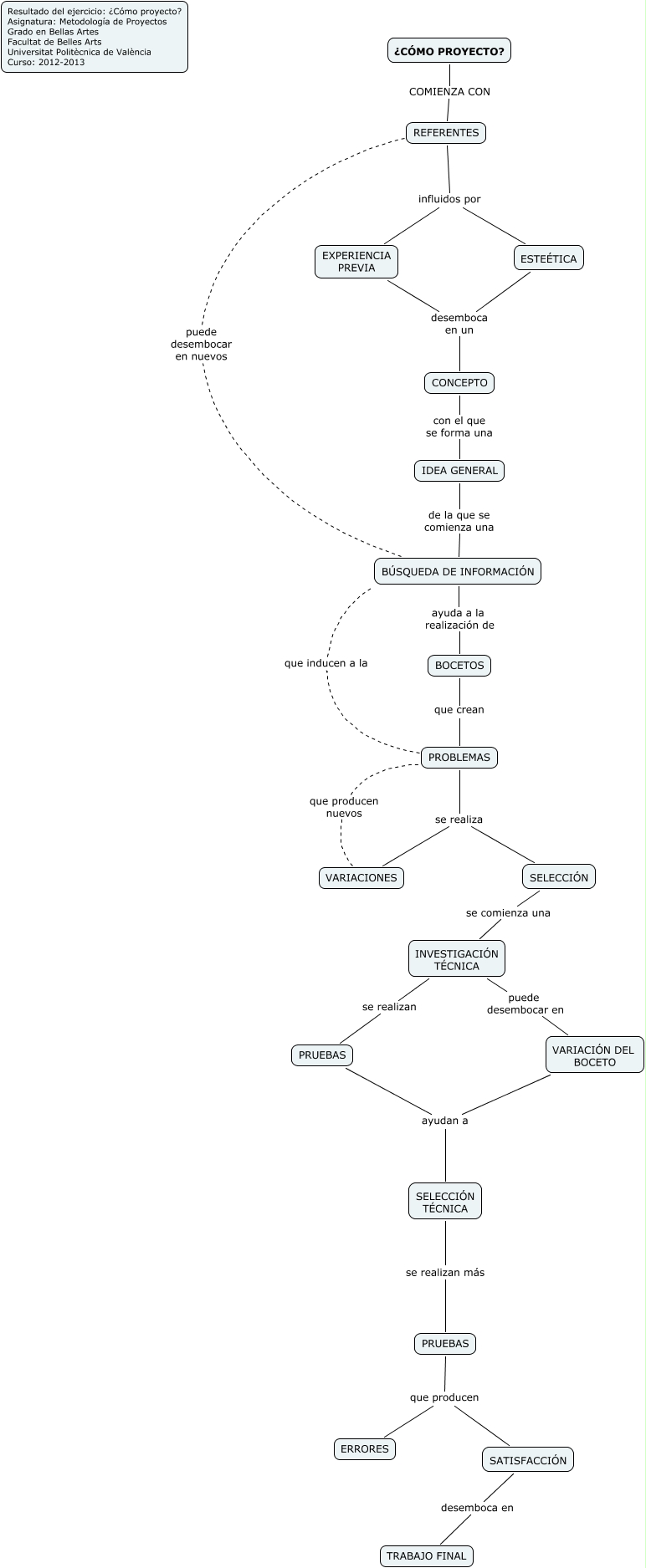Este Cmap, tiene información relacionada con: Como proyecto Laura Assucena, PROBLEMAS se realiza SELECCIÓN, INVESTIGACIÓN TÉCNICA se realizan PRUEBAS, EXPERIENCIA PREVIA desemboca en un CONCEPTO, VARIACIÓN DEL BOCETO ayudan a SELECCIÓN TÉCNICA, PRUEBAS que producen ERRORES, SELECCIÓN TÉCNICA se realizan más PRUEBAS, ESTEÉTICA desemboca en un CONCEPTO, SATISFACCIÓN desemboca en TRABAJO FINAL, PROBLEMAS que inducen a la BÚSQUEDA DE INFORMACIÓN, PROBLEMAS se realiza VARIACIONES, BÚSQUEDA DE INFORMACIÓN ayuda a la realización de BOCETOS, IDEA GENERAL de la que se comienza una BÚSQUEDA DE INFORMACIÓN, VARIACIONES que producen nuevos PROBLEMAS, CONCEPTO con el que se forma una IDEA GENERAL, REFERENTES influidos por EXPERIENCIA PREVIA, BÚSQUEDA DE INFORMACIÓN puede desembocar en nuevos REFERENTES, REFERENTES influidos por ESTEÉTICA, ¿CÓMO PROYECTO? COMIENZA CON REFERENTES, INVESTIGACIÓN TÉCNICA puede desembocar en VARIACIÓN DEL BOCETO, SELECCIÓN se comienza una INVESTIGACIÓN TÉCNICA