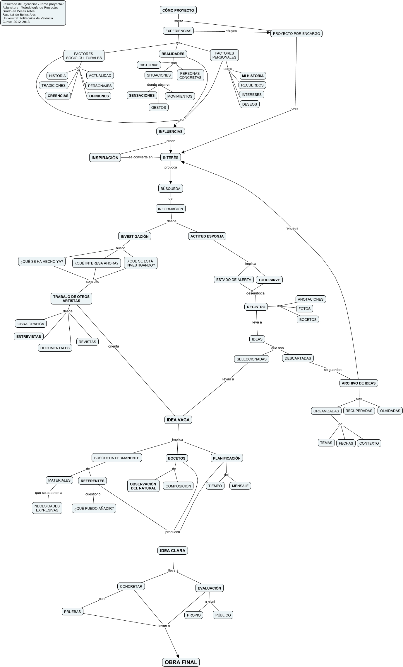 Este Cmap, tiene información relacionada con: Espí Soler, María, TRABAJO DE OTROS ARTISTAS desde ENTREVISTAS, ACTITUD ESPONJA implica ESTADO DE ALERTA, FACTORES SOCIO-CULTURALES son ACTUALIDAD, SITUACIONES donde observo GESTOS, ¿QUÉ SE ESTÁ INVESTIGANDO? consulto TRABAJO DE OTROS ARTISTAS, ESTADO DE ALERTA desemboca REGISTRO, CÓMO PROYECTO reúno EXPERIENCIAS, BÚSQUEDA PERMANENTE de MATERIALES, CÓMO PROYECTO reúno PROYECTO POR ENCARGO, REALIDADES son PERSONAS CONCRETAS, INVESTIGACIÓN busco ¿QUÉ INTERESA AHORA?, ¿QUÉ SE HA HECHO YA? consulto TRABAJO DE OTROS ARTISTAS, DESCARTADAS se guardan ARCHIVO DE IDEAS, ARCHIVO DE IDEAS renueva INTERÉS, REALIDADES son INFLUENCIAS, IDEAS que son SELECCIONADAS, IDEA VAGA implica BOCETOS, REGISTRO en ANOTACIONES, FACTORES SOCIO-CULTURALES son PERSONAJES, REFERENTES cuestiono ¿QUÉ PUEDO AÑADIR?